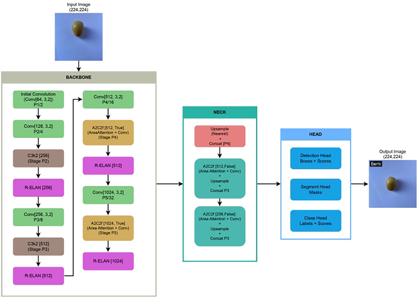 Figure 3. Architecture of our fine-tuned YOLOv12 model applied to our collected Rutab dataset, illustrating key components such as backbone, neck, and head, along with modifications introduced during fine-tuning for improved classification performance.