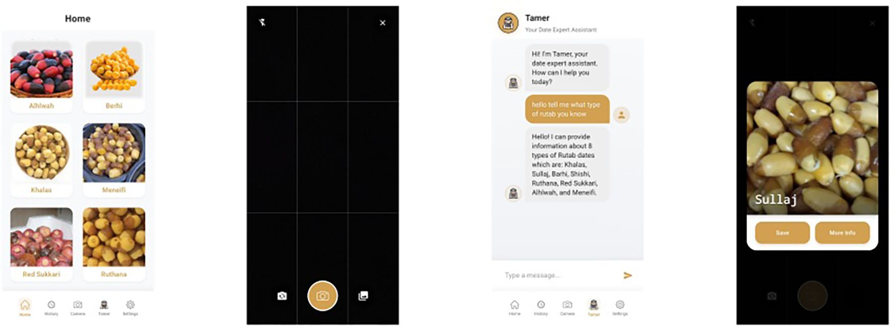 Figure 4. Sample screenshots from our developed mobile application, showcasing the integration of the best-performing classification model—YOLOv12 in our case—demonstrate the system’s real-time capability in accurately identifying Rutab date varieties.