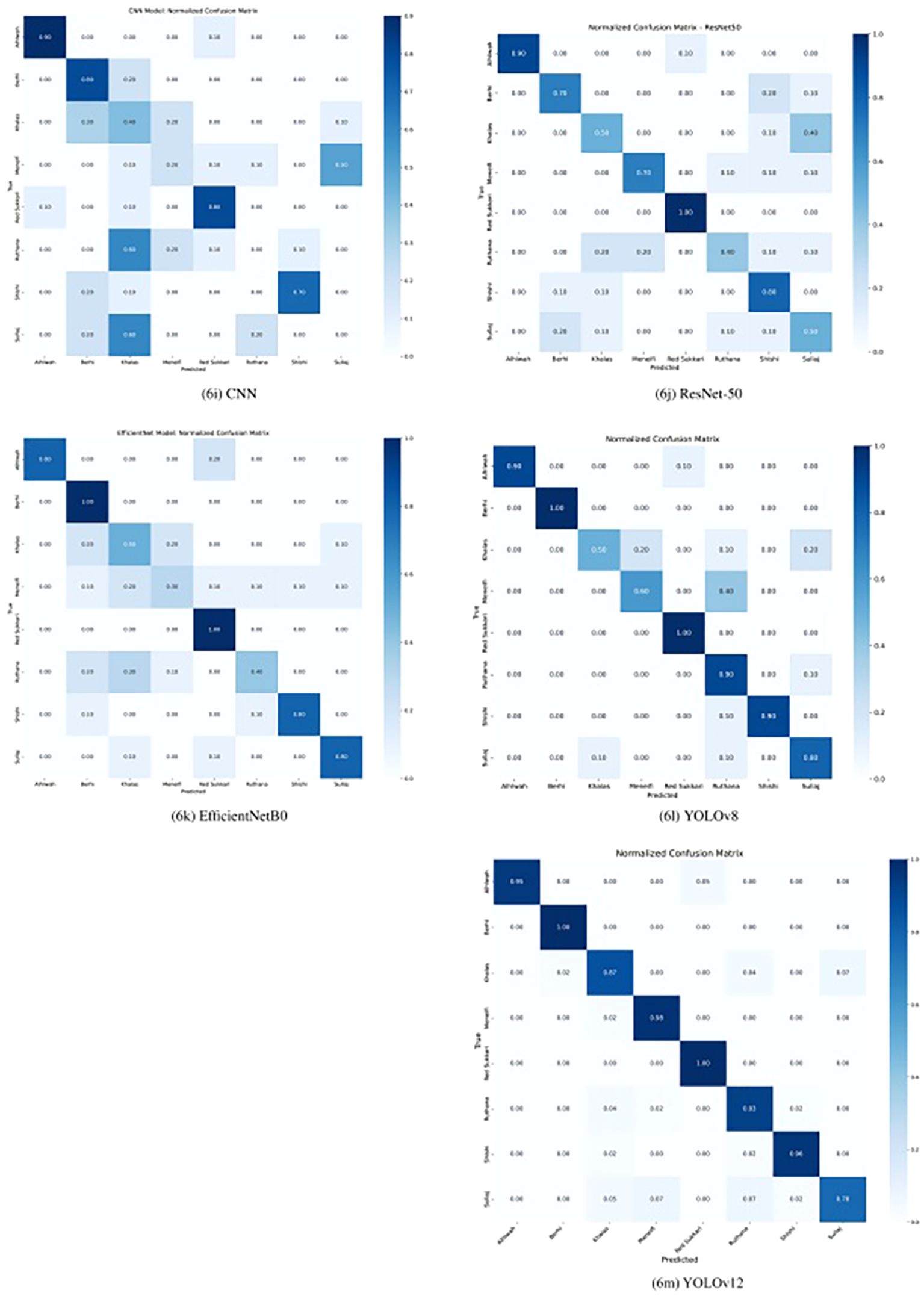Across the five evaluated models—CNN, EfficientNetB0, ResNet-50, YOLOv8, and YOLOv12—the confusion matrices reveal distinct patterns in classification performance for Rutab date varieties, as shown in Figure 6. YOLOv12 outperforms all previous models, achieving near-perfect recall across most classes: 100% for Berhi, and Red Sukkari; 98% for Menefi; 96% for Shishi; 95% for Alhlwah; and 93% for Ruthana. It also significantly improves classification of Khalas (87% recall) and Sullaj (78% recall), which were previously challenging for other models. YOLOv8 had already shown strong performance, especially on Berhi, Red Sukkari, Ruthana, Alhlwah, and Shishi, but YOLOv12 further reduces confusion and boosts accuracy across all classes. EfficientNetB0 and ResNet-50 showed moderate success, with EfficientNet performing well on Berhi and Red Sukkari, while ResNet handled Meneifi more effectively. The CNN model struggled significantly, failing to correctly classify Ruthana and Sullaj altogether and showing high misclassification rates among visually similar brown varieties like Khalas and Meneifi.