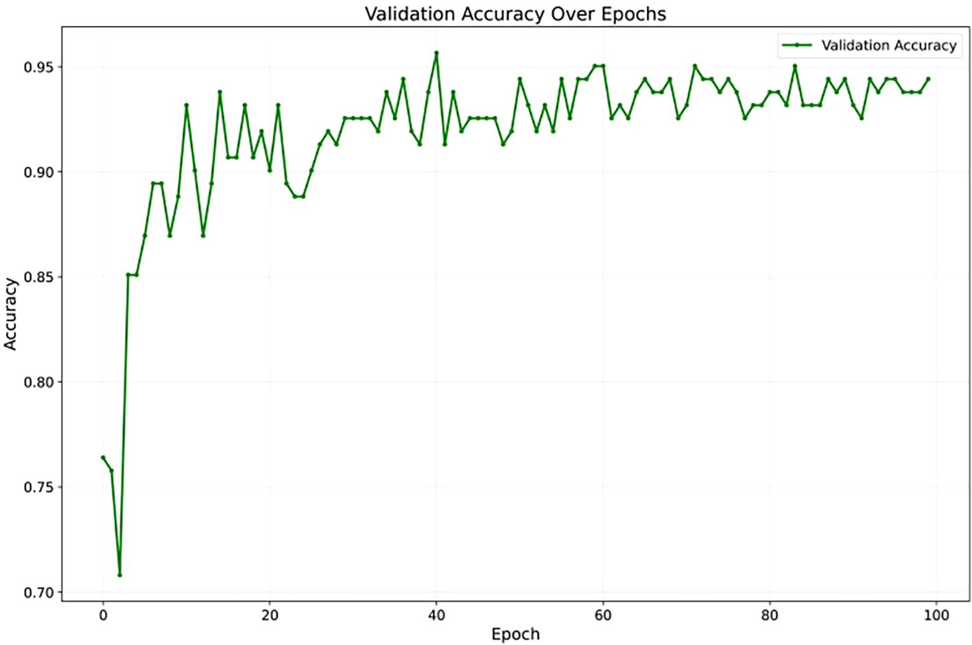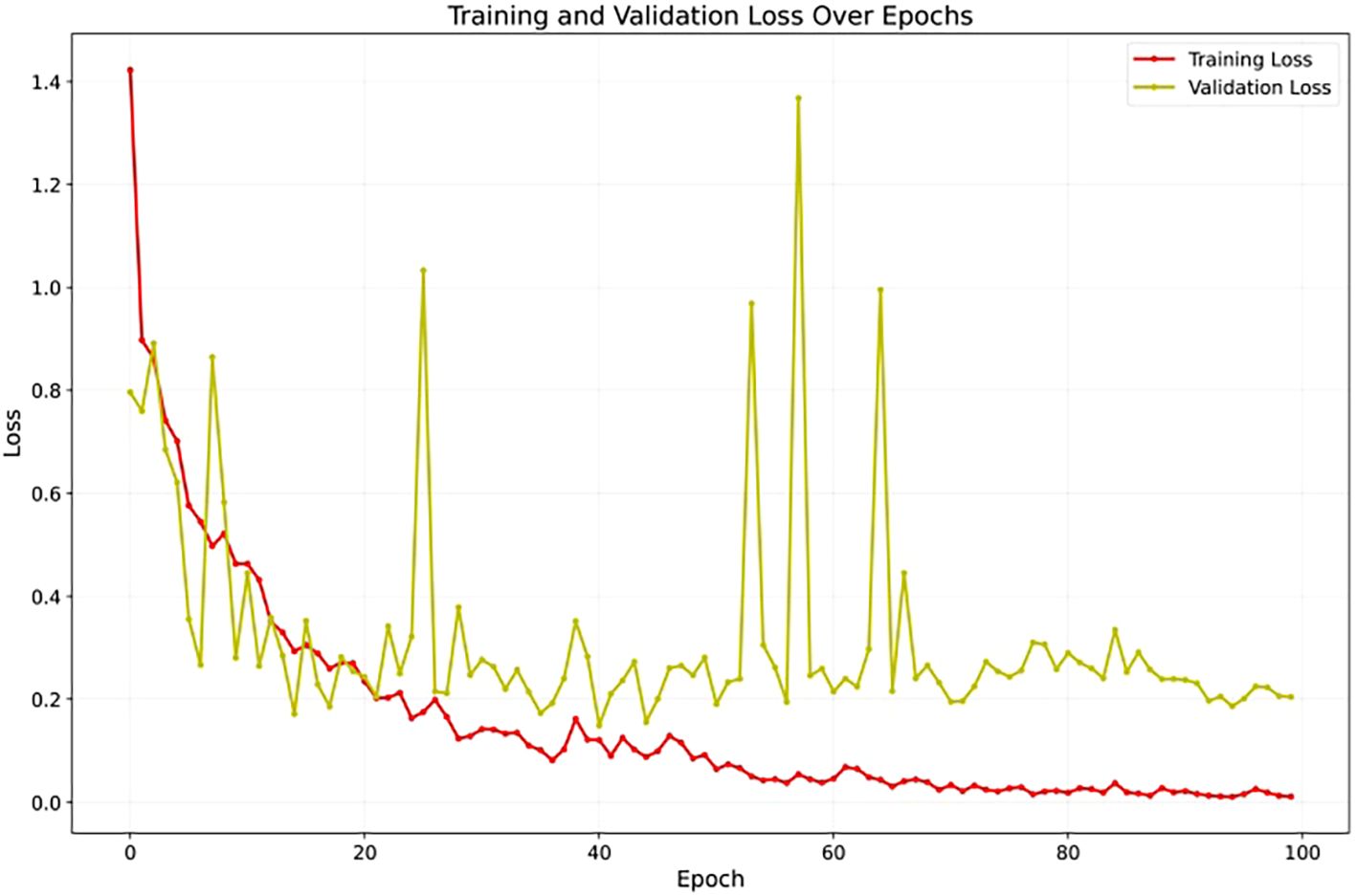 To assess YOLOv12’s learning stability, Figure 7 illustrates its accuracy on the validation set across training epochs. The curve shows a consistent upward trend, converging smoothly without unexpected fluctuations or divergence. The absence of instability and the sustained improvement in accuracy suggest that the model generalizes well to unseen data, offering strong evidence against overfitting throughout the training process. Also, Figure 8 presents the training and validation loss curves over the same epochs. The loss steadily decreases for both sets, further confirming the model’s effective learning and stable training process without divergence.
