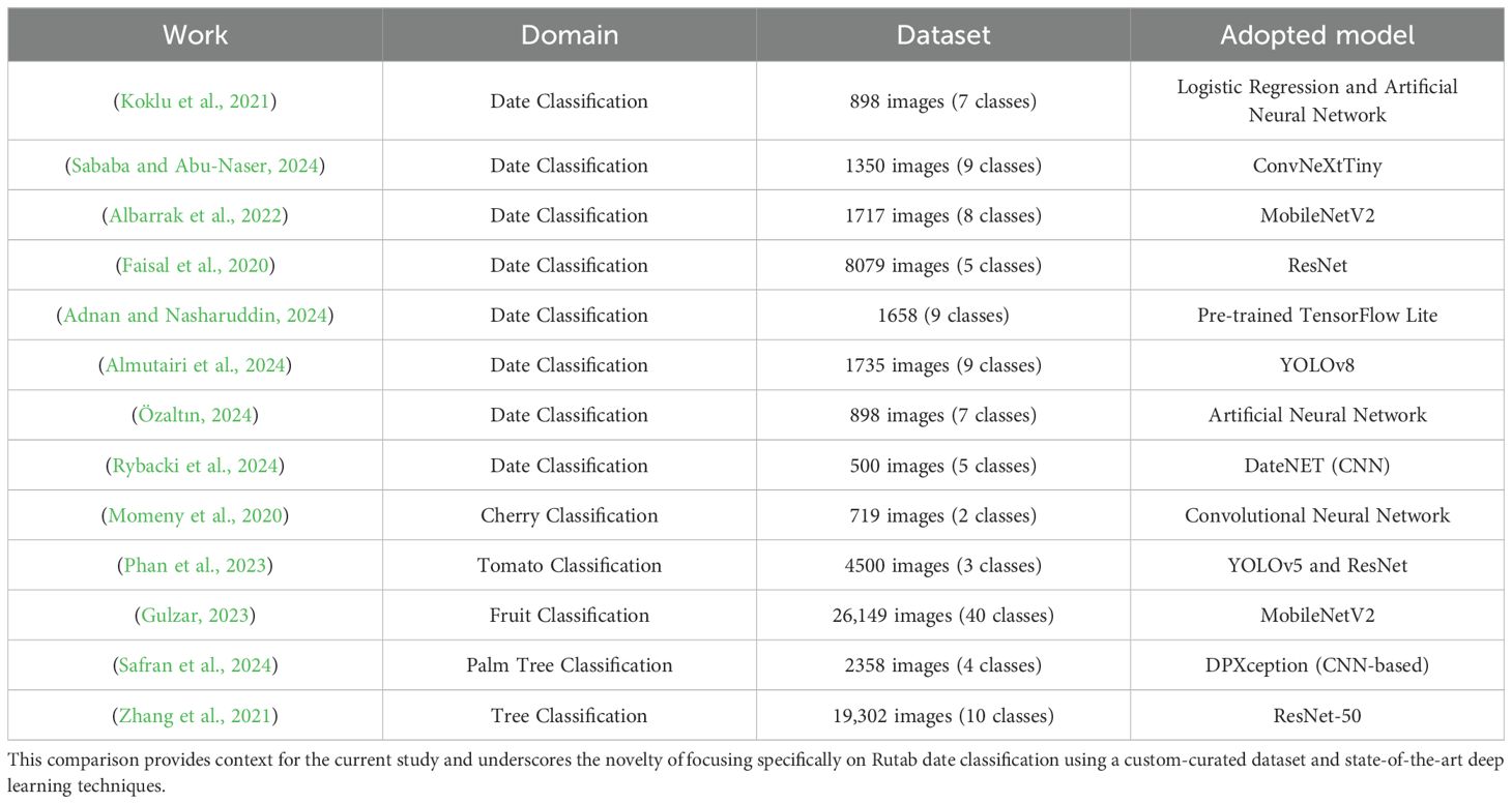 While these studies demonstrate impressive accuracy in classifying date varieties, it is important to note that most of them focus on the Tamar stage, where visual differences between varieties are more pronounced. Tamar dates typically exhibit distinct color, texture, and dryness, which provide clearer cues for image-based models. In contrast, Rutab dates, which are semi-ripe, often share similar color tones and smooth textures, making them harder to distinguish. This visual similarity among Rutab varieties introduces greater intra-class ambiguity and inter-class overlap, which can reduce classification performance even with advanced models. Our study in this paper addresses this gap by focusing specifically on the Rutab stage, where classification remains underexplored and more complex.