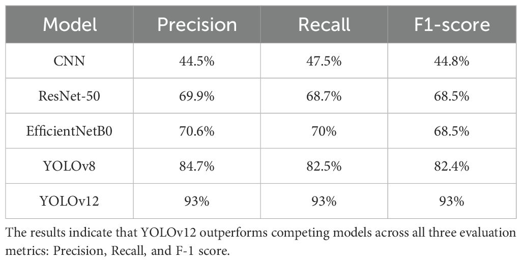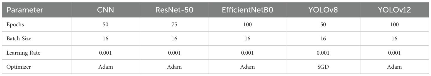 In this section, we explicitly present the key hyperparameters used for training the selected deep learning models. A batch size of 16 and an initial learning rate of 0.001 were consistently applied across all models. The number of training epochs varied by model, based on preliminary experiments and the point at which validation performance converged: 50 epochs for both the CNN and YOLOv8, 75 epochs for ResNet-50, and 100 epochs for EfficientNetB0 and YOLOv12. These choices reflect an empirical balance between training time and performance stability. Table 3 provides a summary of the training hyperparameter configurations employed for all models evaluated in this study.