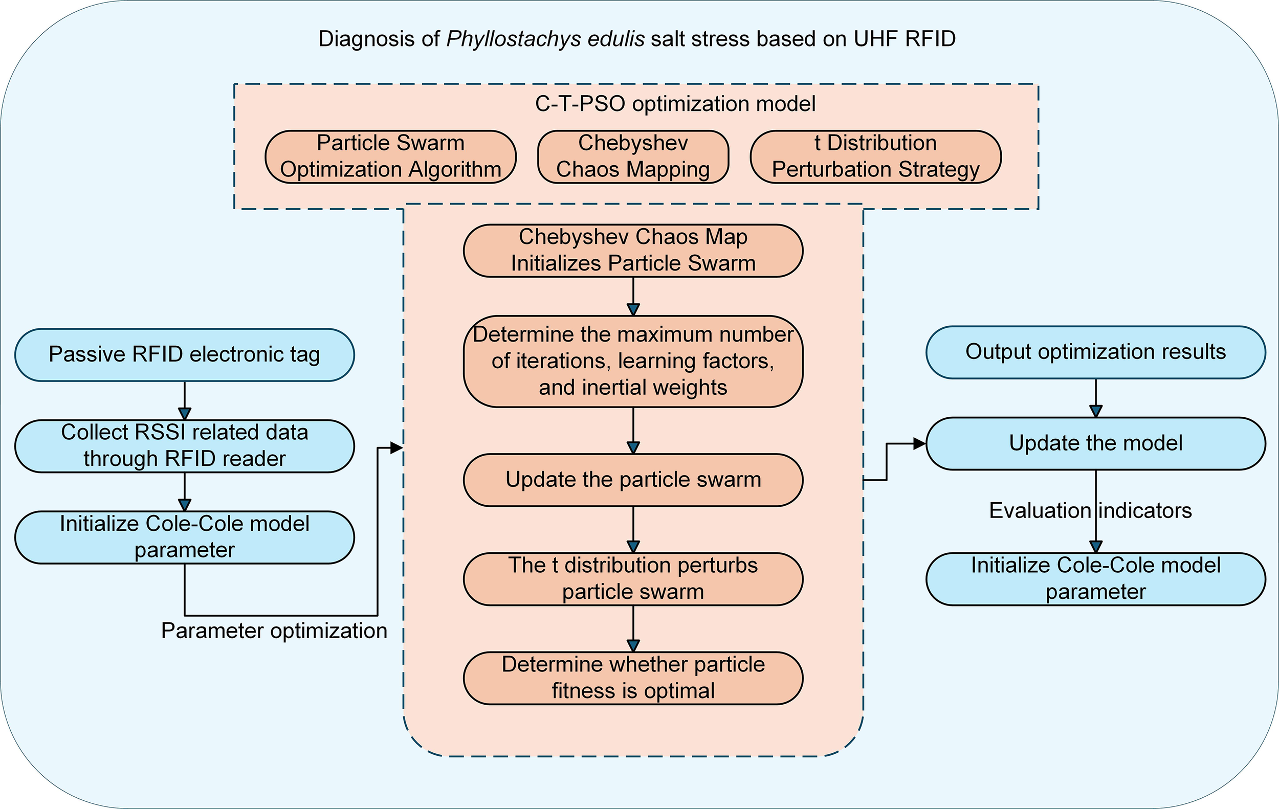 Based on the mechanism of salt stress regulating ion concentration in cell sap, a Cole-Cole dielectric model detection framework was constructed by analyzing intrinsic correlations between RFID backscattering signal features and medium dielectric properties. An improved Particle Swarm Optimization (C-T-PSO) algorithm employing Chebyshev chaotic mapping for population initialization and t-distribution dynamic perturbation mechanism was developed to synergistically optimize Cole-Cole model parameters.