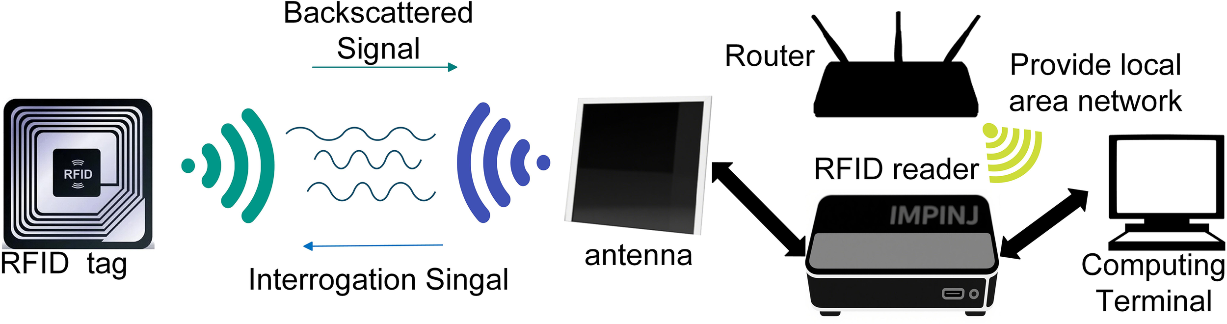The hardware of the data acquisition system mainly includes RFID tags, a reader, and an antenna (Figure 5). The antenna is connected to the reader via a feeder line. The system is powered by a mobile power supply, and a router provides a local area network to ensure communication between the reader and the computer terminal.