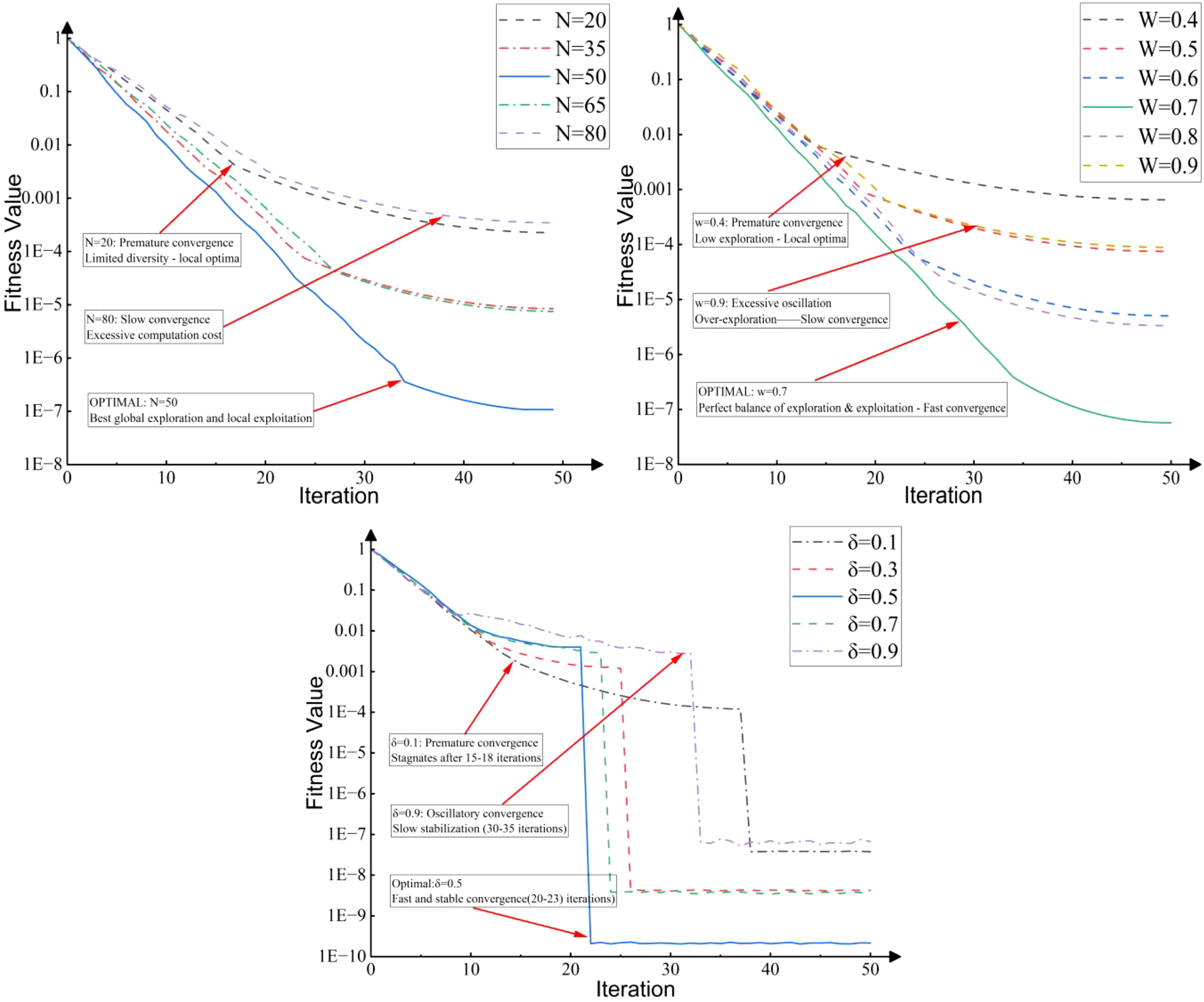 The hyperparameters of the C-T-PSO algorithm were initially determined based on empirical conventions and preliminary experiments. To further validate the robustness and generalizability of these choices, a comprehensive sensitivity analysis was conducted on three key parameters: population size (N), inertia weight (w), and scaling factor (δ). As shown in Figure 4: Sensitivity analysis of key parameters.