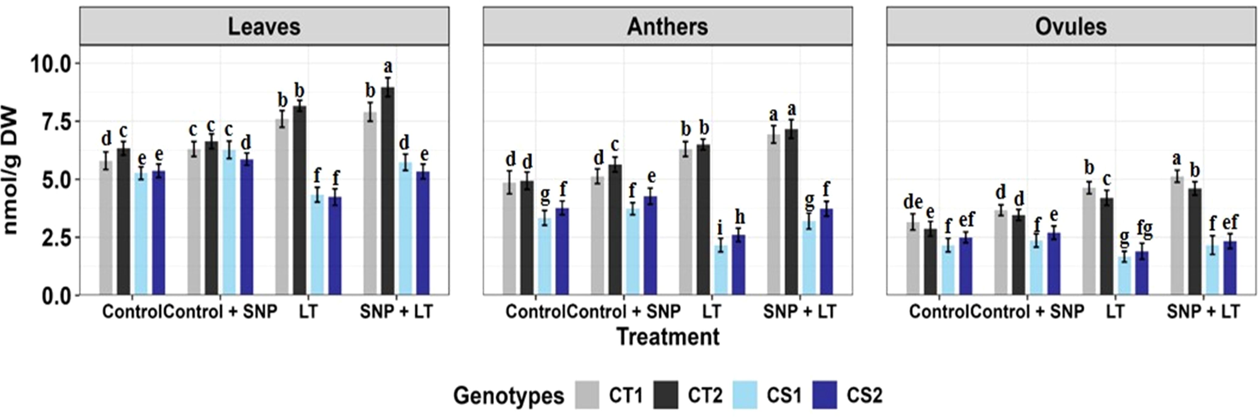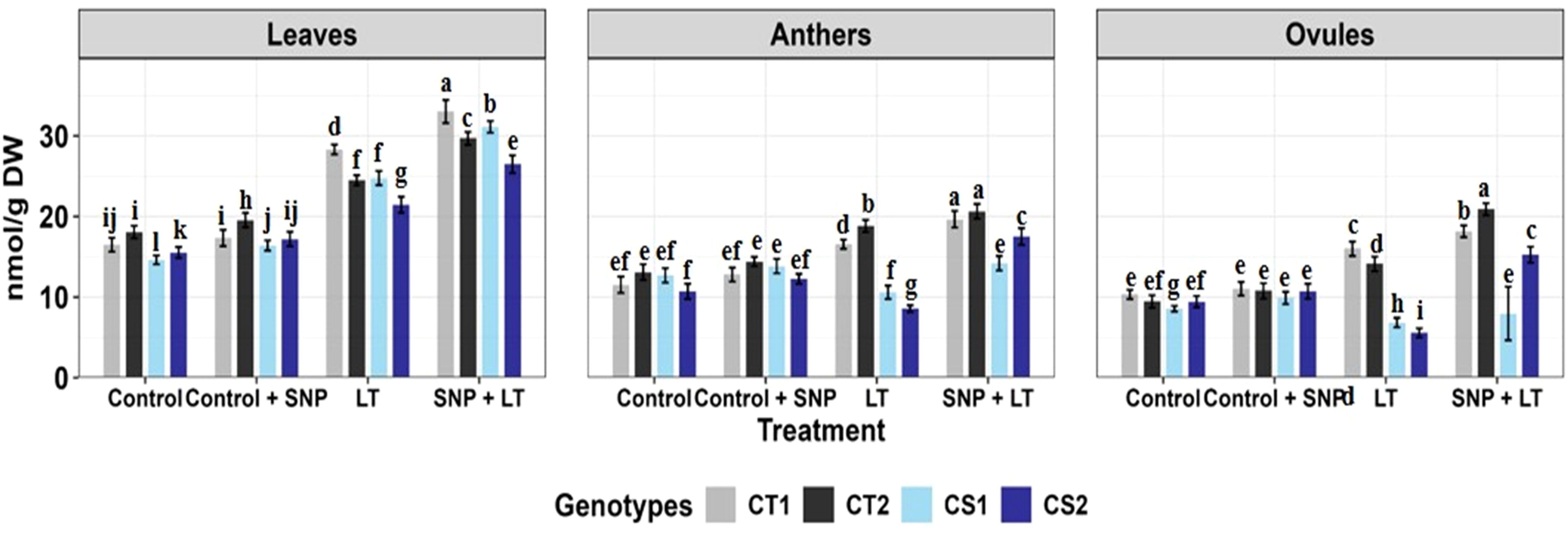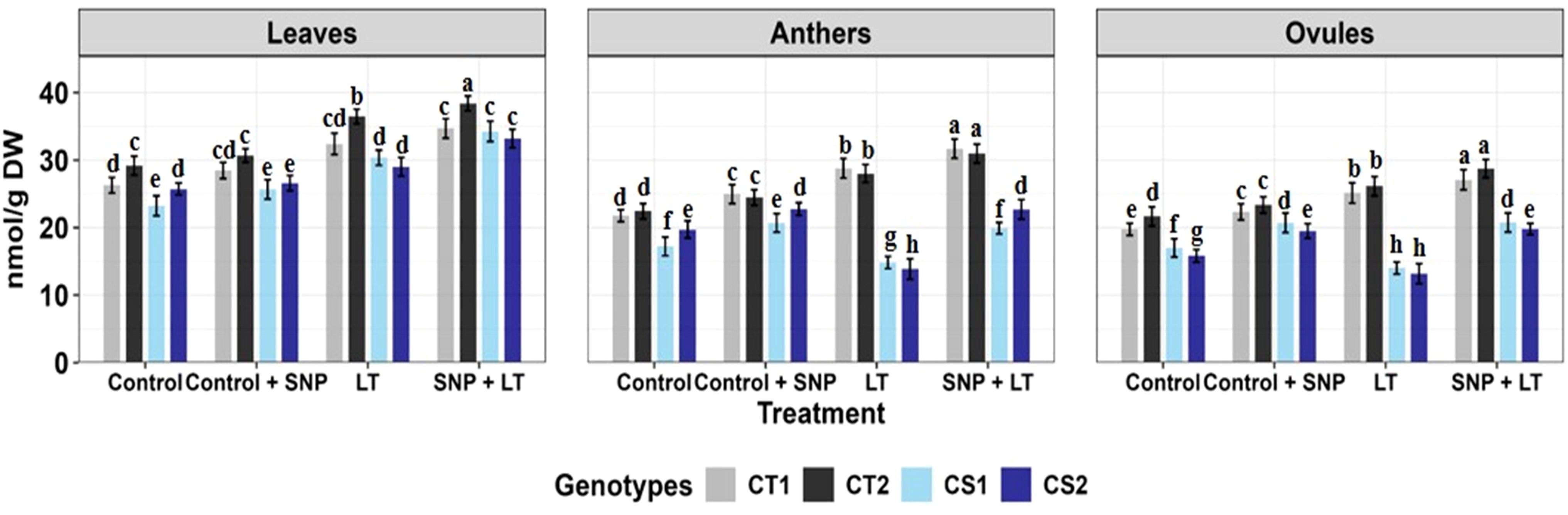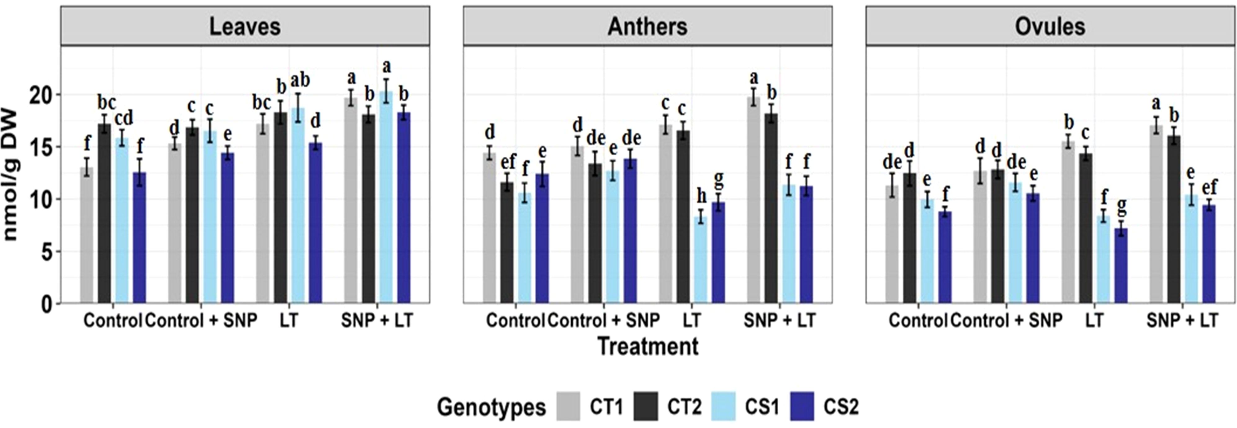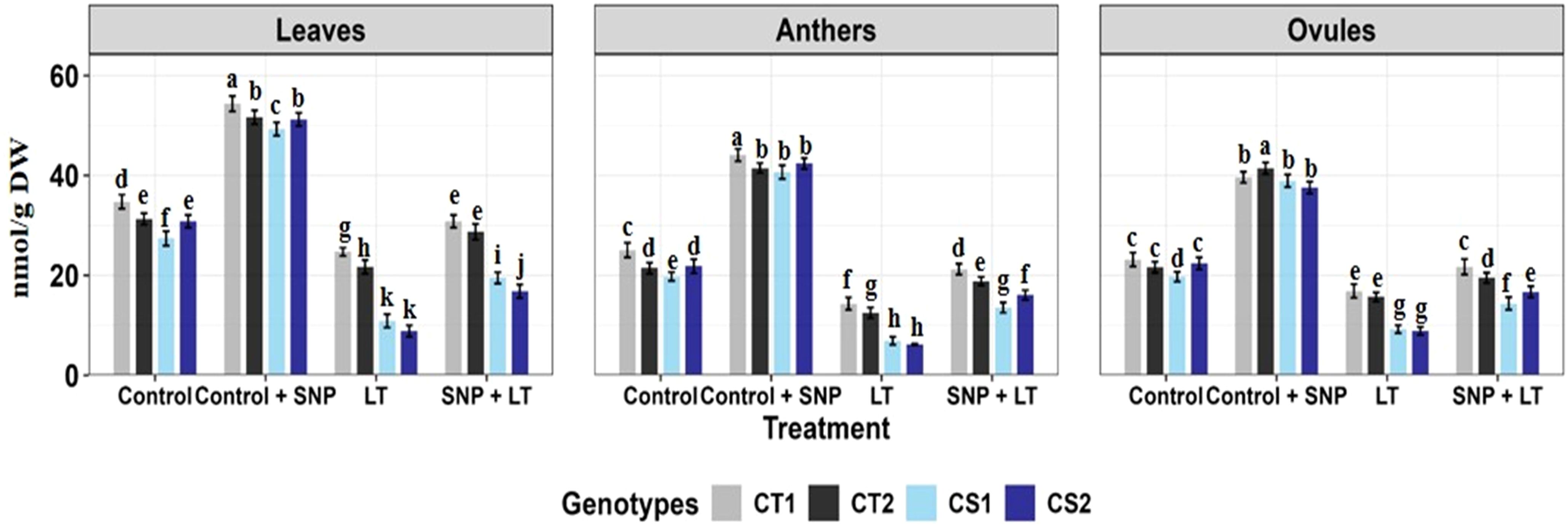 Figure 1. Endogenous NO levels (nmol/g DW) in three organs (leaves, anthers, ovules) of four contrasting genotypes (CT1: ICC 17258; CT2: ICC 16349; CS1: ICC 15567; CS2: GPF-2) under different treatments: Control, Control + SNP, Low Temperature (LT), and SNP + LT. Data represent mean ± SE (n = 3). Different lowercase letters indicate significant differences among genotype *treatment interaction according to Tukey's test (p<0.05), within each organ.
