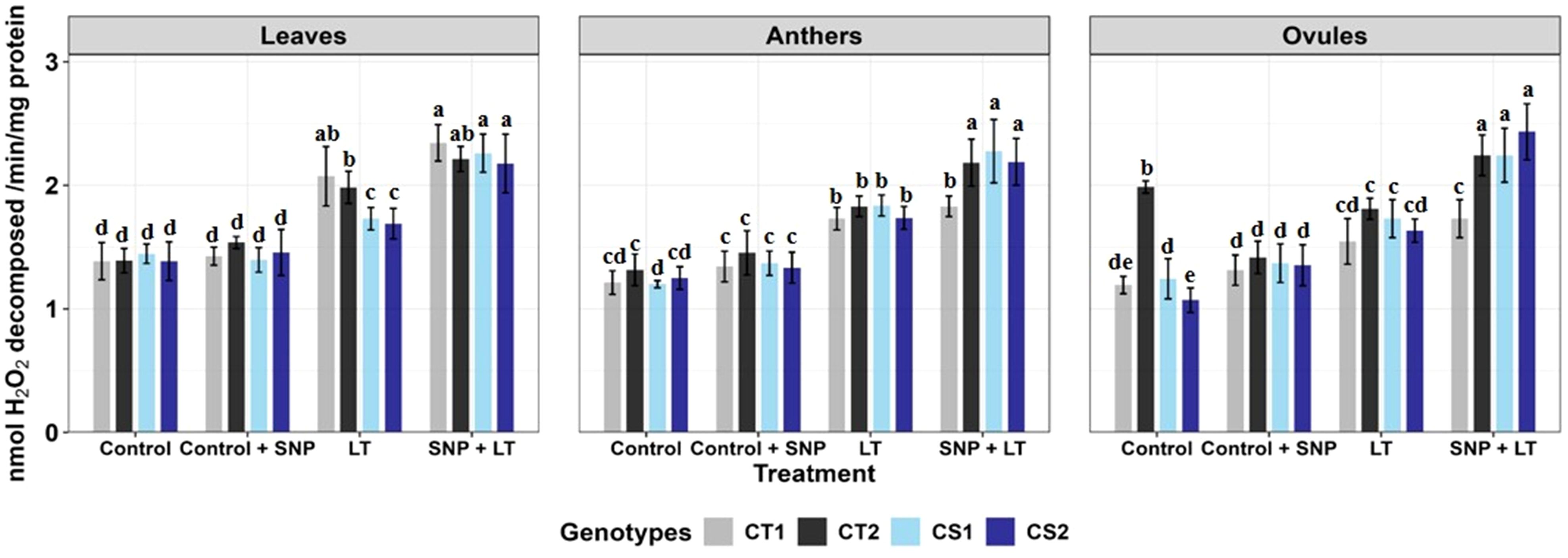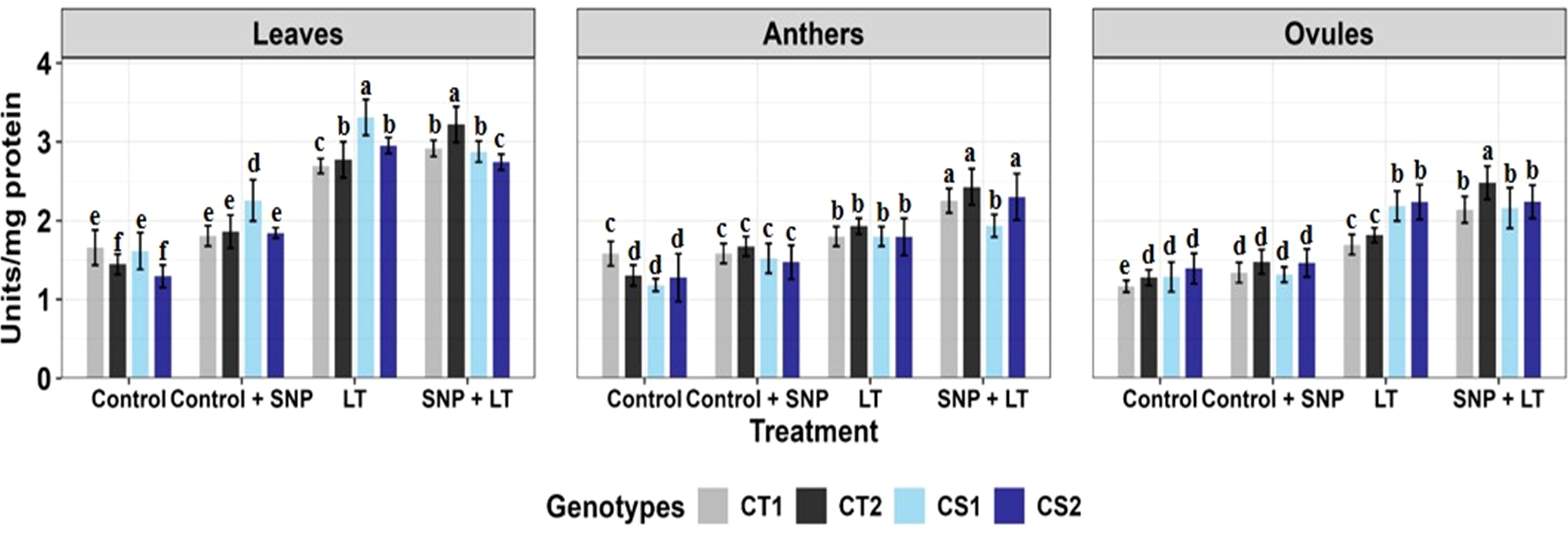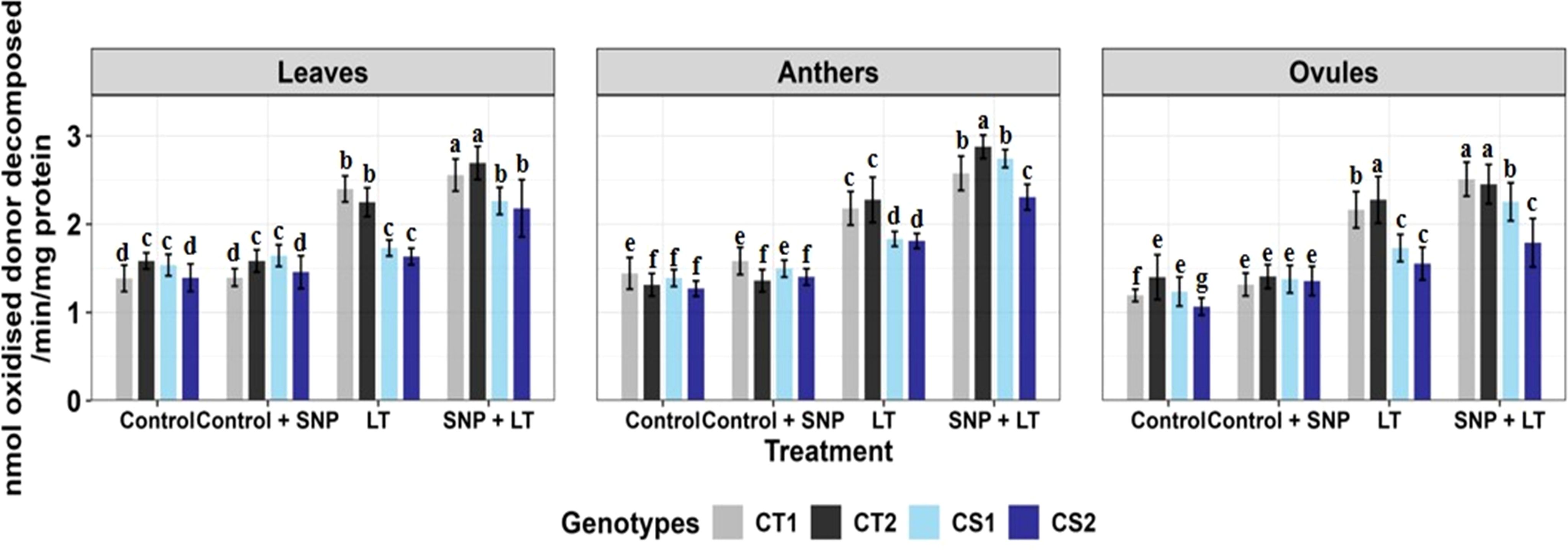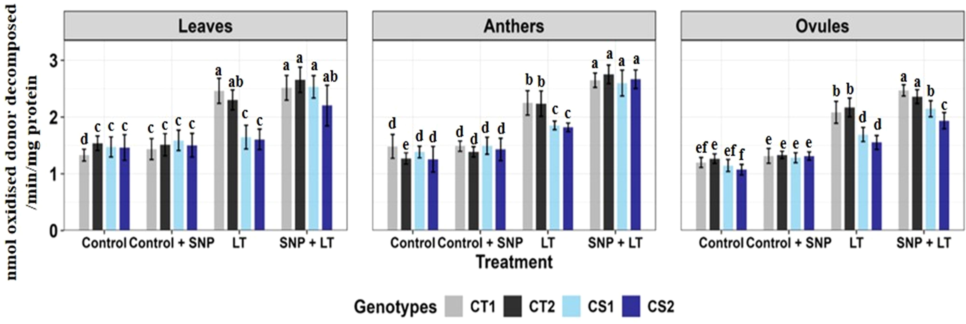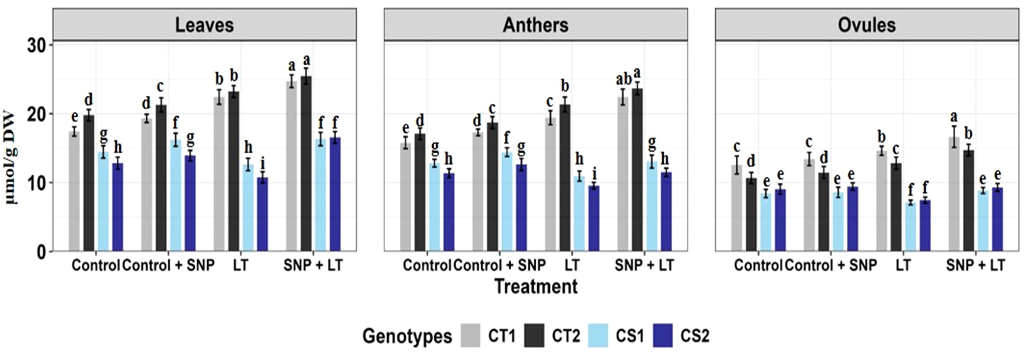 Figure 1. Endogenous NO levels (nmol/g DW) in three organs (leaves, anthers, ovules) of four contrasting genotypes (CT1: ICC 17258; CT2: ICC 16349; CS1: ICC 15567; CS2: GPF-2) under different treatments: Control, Control + SNP, Low Temperature (LT), and SNP + LT. Data represent mean ± SE (n = 3). Different lowercase letters indicate significant differences among genotype *treatment interaction according to Tukey's test (p<0.05), within each organ.