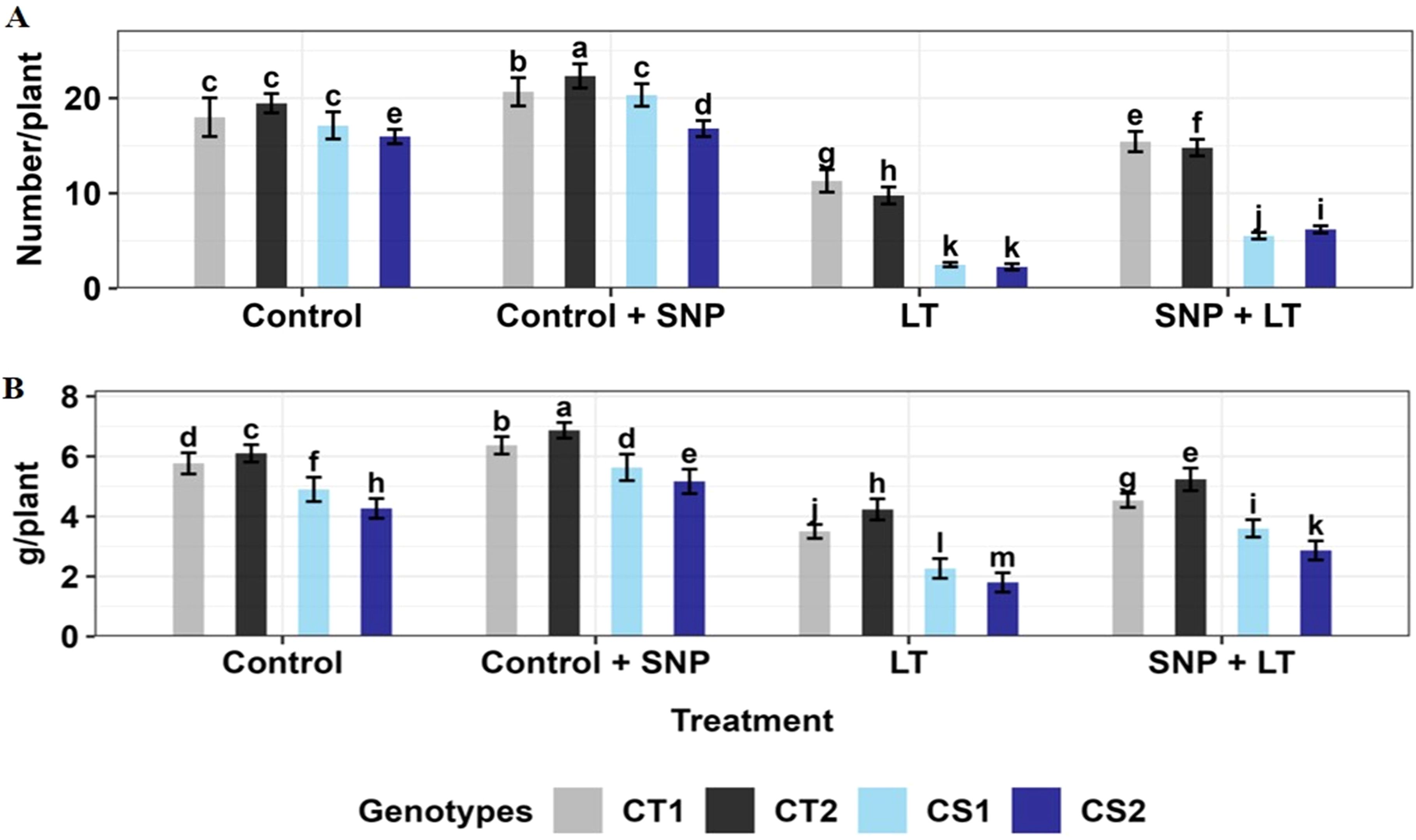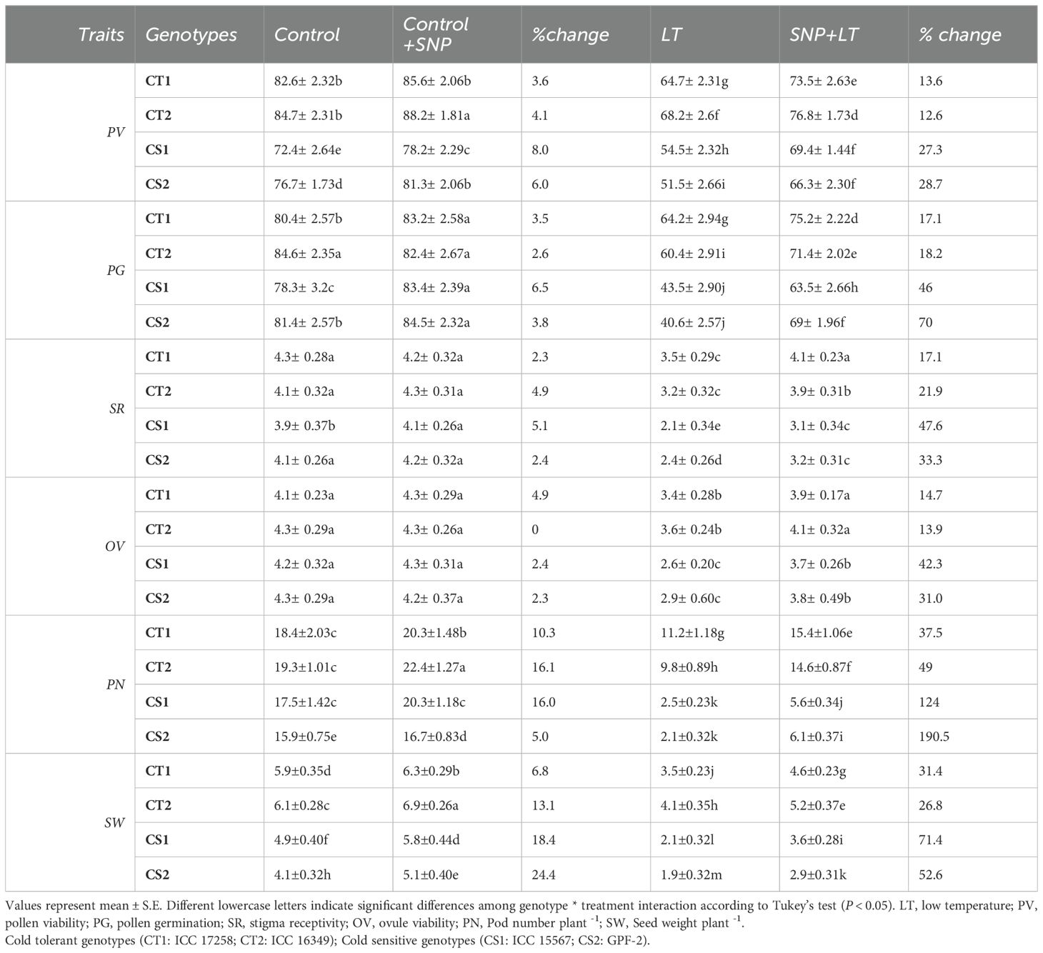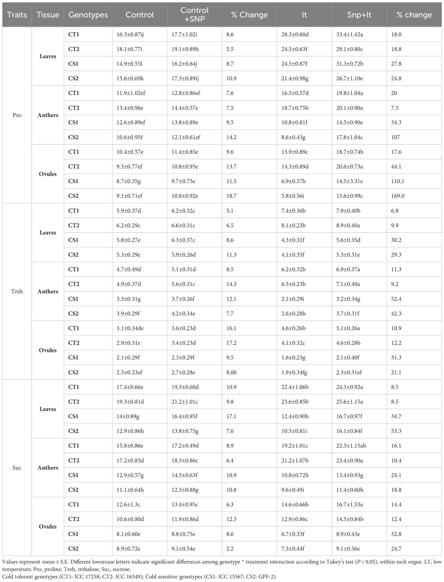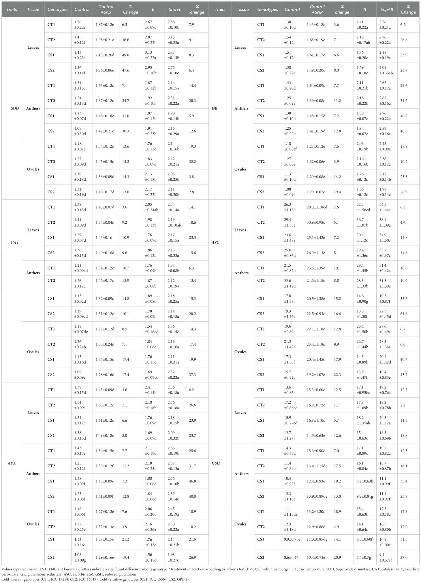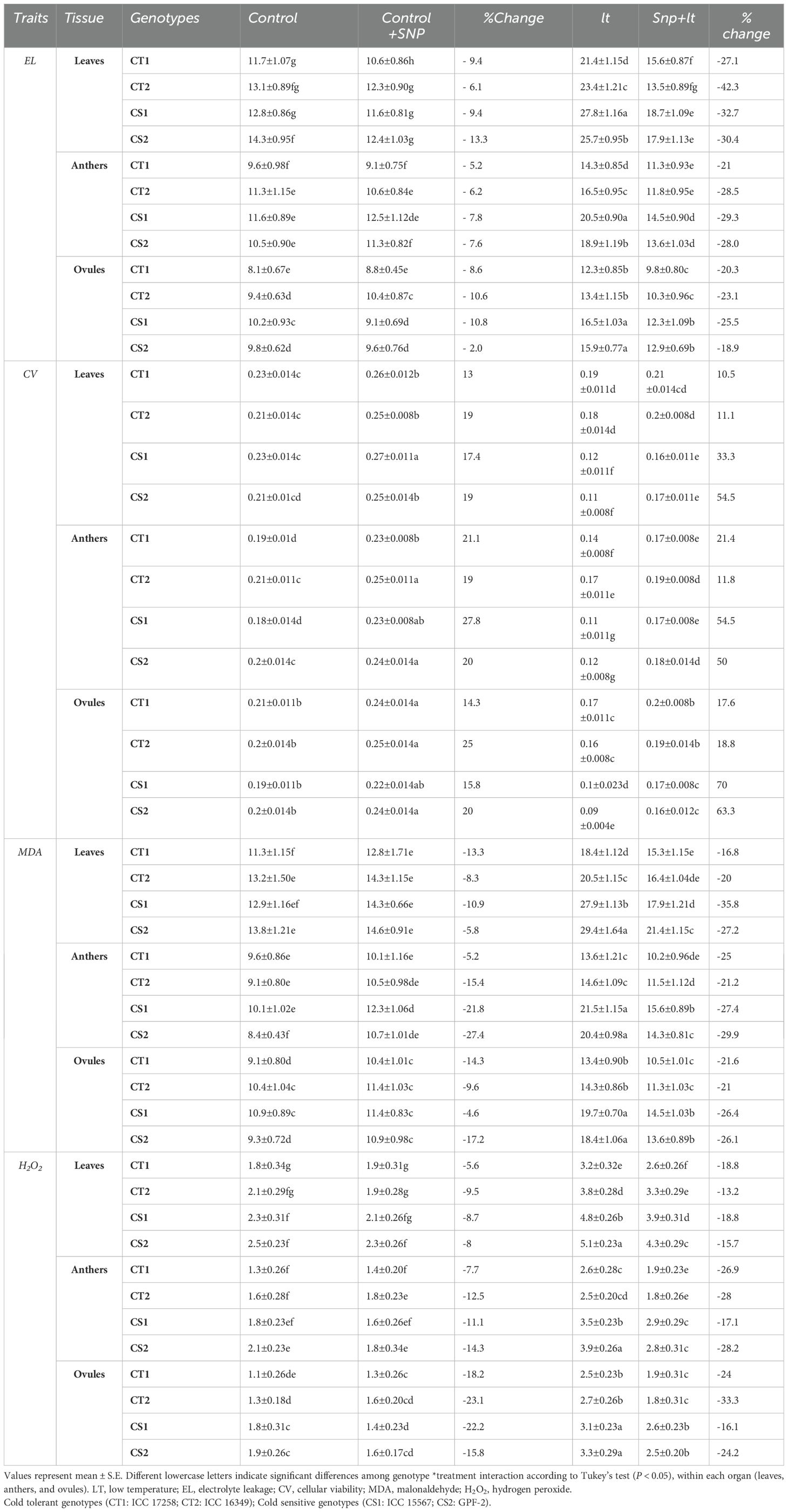 Figure 1. Endogenous NO levels (nmol/g DW) in three organs (leaves, anthers, ovules) of four contrasting genotypes (CT1: ICC 17258; CT2: ICC 16349; CS1: ICC 15567; CS2: GPF-2) under different treatments: Control, Control + SNP, Low Temperature (LT), and SNP + LT. Data represent mean ± SE (n = 3). Different lowercase letters indicate significant differences among genotype *treatment interaction according to Tukey's test (p<0.05), within each organ.
