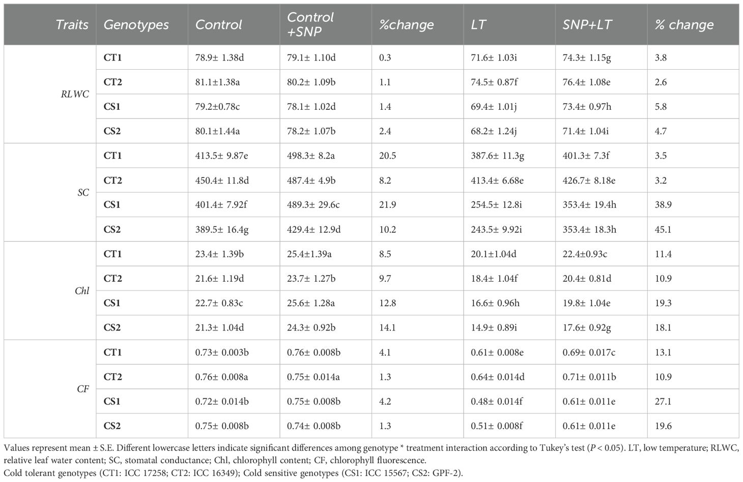 With climate change increasing the frequency and severity of extreme weather events, improving cold stress tolerance in chickpeas has become an urgent breeding and agronomic priority. One promising strategy involves the application of nitric oxide (NO), a versatile signaling molecule that plays a key role in modulating plant responses to abiotic stressors. Nitric oxide (NO) has been extensively studied for its ability to enhance stress tolerance in various species, including cold stress (Siddiqui et al., 2011; Puyaubert and Baudouin, 2014; Fancy et al., 2017). It acts as a regulator of physiological and molecular responses by modulating antioxidant defenses, maintaining cellular redox balance, and activating the expression of stress-responsive genes (Esim et al., 2014; Zhang et al., 2019; Wang et al., 2021). In cold-stressed tea plants, NO elevates the levels of protective metabolites, including gamma-aminobutyric acid (GABA), proline, and sugars (Wang et al., 2021). In wheat, NO application preserves the integrity of the photosynthetic apparatus and stabilizes the cell membranes under cold stress (Feng et al., 2021). The protective role of NO is multifaceted; it can directly scavenge reactive oxygen species (ROS), enhance the activity of antioxidant enzymes, and mitigate oxidative damage to cellular components, including lipids, proteins, and nucleic acids (Fan et al., 2015). Additionally, NO interacts with other signaling molecules to activate cold-responsive pathways and gene expression, thereby safeguarding cellular structures under stress (Feng et al., 2021; Wu et al., 2022).