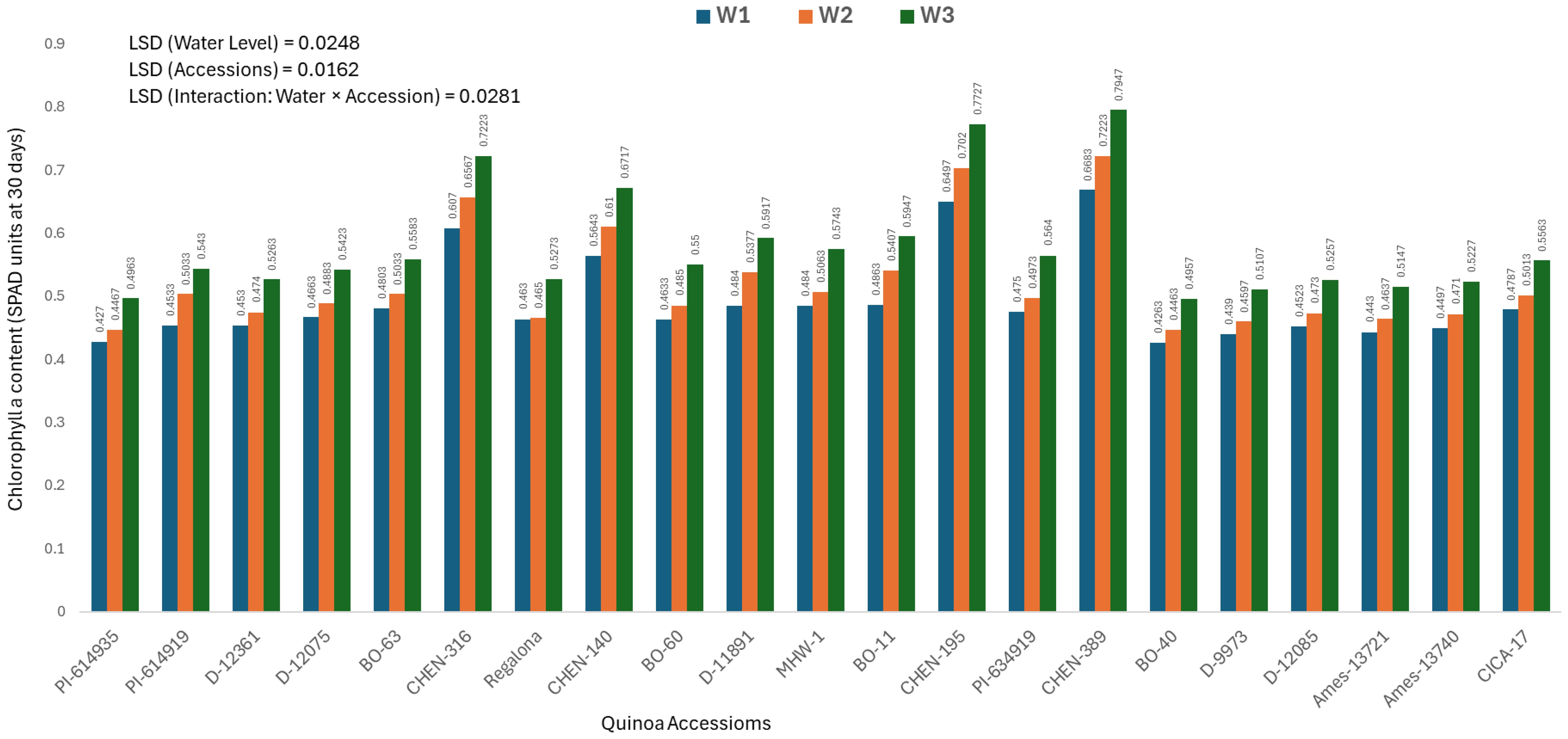 Chlorophyll a concentration reflects early photosynthetic efficiency and is a useful indicator of stress response in plants. The analysis of variance revealed significant differences among quinoa accessions, irrigation treatments, and their interaction. Therefore, only genotype × irrigation interaction data are presented. The highest chlorophyll a level at 30 days was recorded in ‘CHEN-316’ under W1 (5 minutes twice daily; 0. 7947± 0.0063 mg/100g), followed by ‘CHEN-195’ (0.7727± 0.0063 mg/100g), both under W1 (Figure 1). These genotypes displayed superior physiological stability and maintained high chlorophyll levels under stress, aligning with previous reports linking chlorophyll retention to drought tolerance in quinoa (Morales et al., 2022; Kiani et al., 2021). In contrast, ‘BO-40’ and ‘PI-614935’ under W3 (15 minutes twice daily) showed the lowest chlorophyll a content (0.4263 ± 0.0063 and 0.4270± 0.0063 mg/100g, respectively), suggesting impaired photosynthetic machinery under limited water supply. The ability of ‘CHEN-316’ and ‘CHEN-195’ to sustain high chlorophyll levels is consistent with their performance across other agronomic traits and highlights their suitability for early stress detection and resilience. These findings are in agreement with prior studies emphasizing the role of chlorophyll a as a sensitive biomarker for evaluating drought stress responses in quinoa and its contribution to biomass accumulation and productivity under water-deficit conditions (Hinojosa et al., 2018; Ruiz et al., 2023).