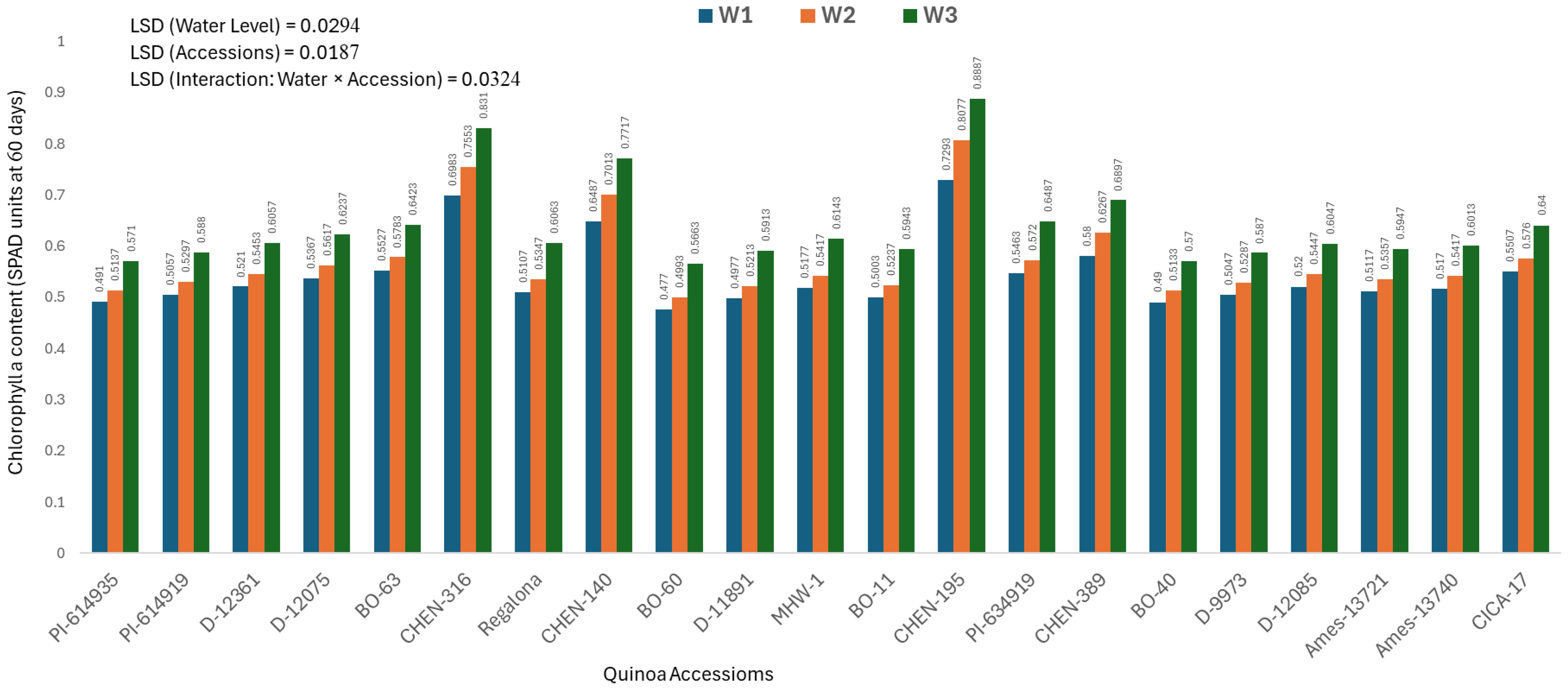 Figure 2. Chlorophyll a content (SPAD readings at 60 days) in 21 quinoa accessions under three irrigation regimes (W1: 15 min twice/day, W2: 10 min twice/day, and W3: 5 min twice/day) in arid conditions.