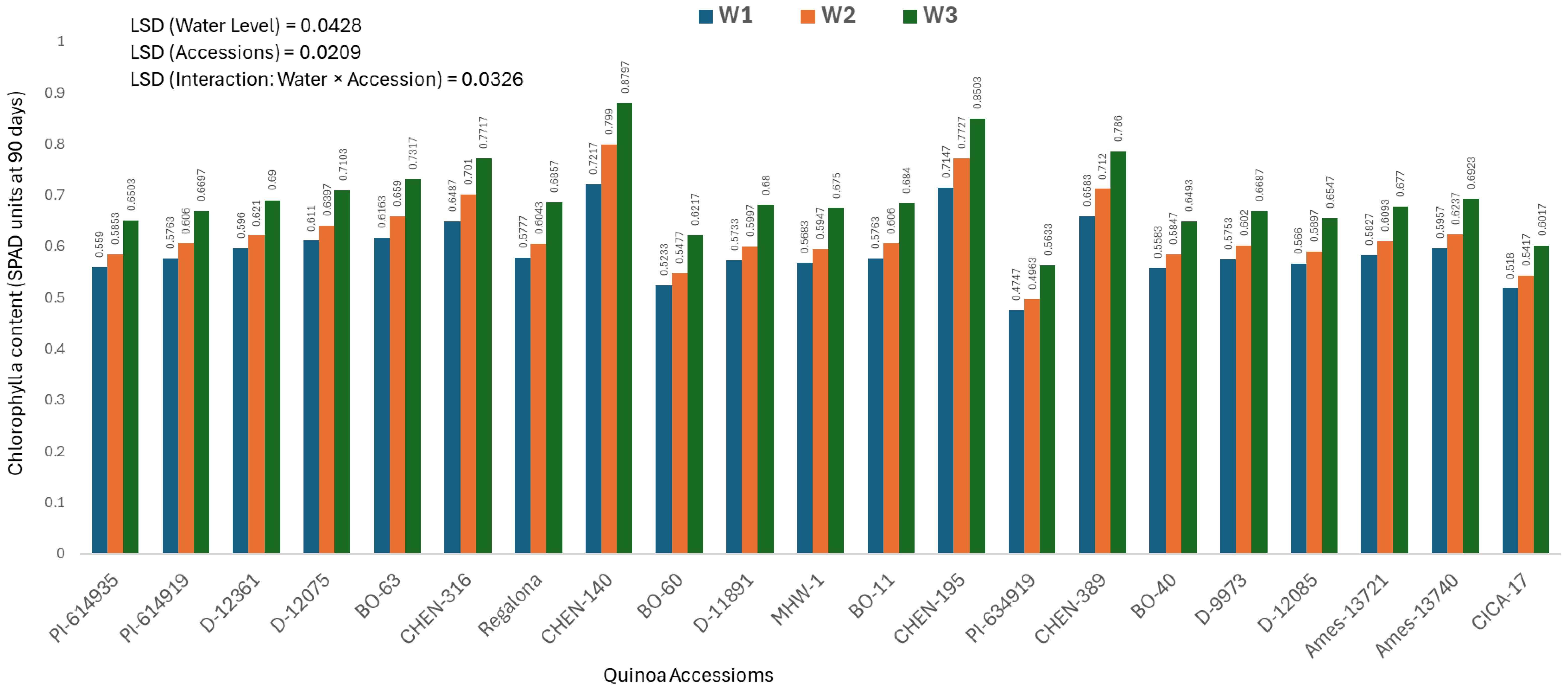 Figure 3. Chlorophyll a content (SPAD readings at 90 days) in 21 quinoa accessions under three irrigation regimes (W1: 15 min twice/day, W2: 10 min twice/day, and W3: 5 min twice/day) in arid conditions.