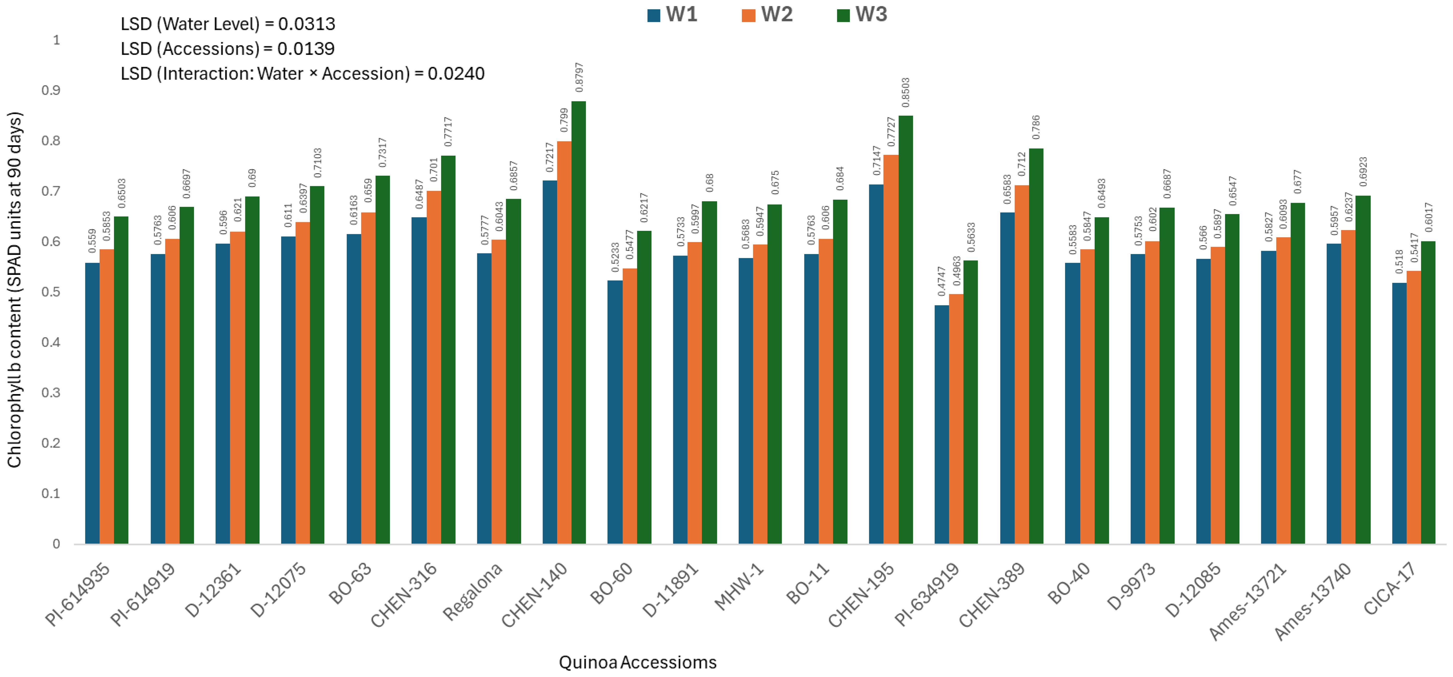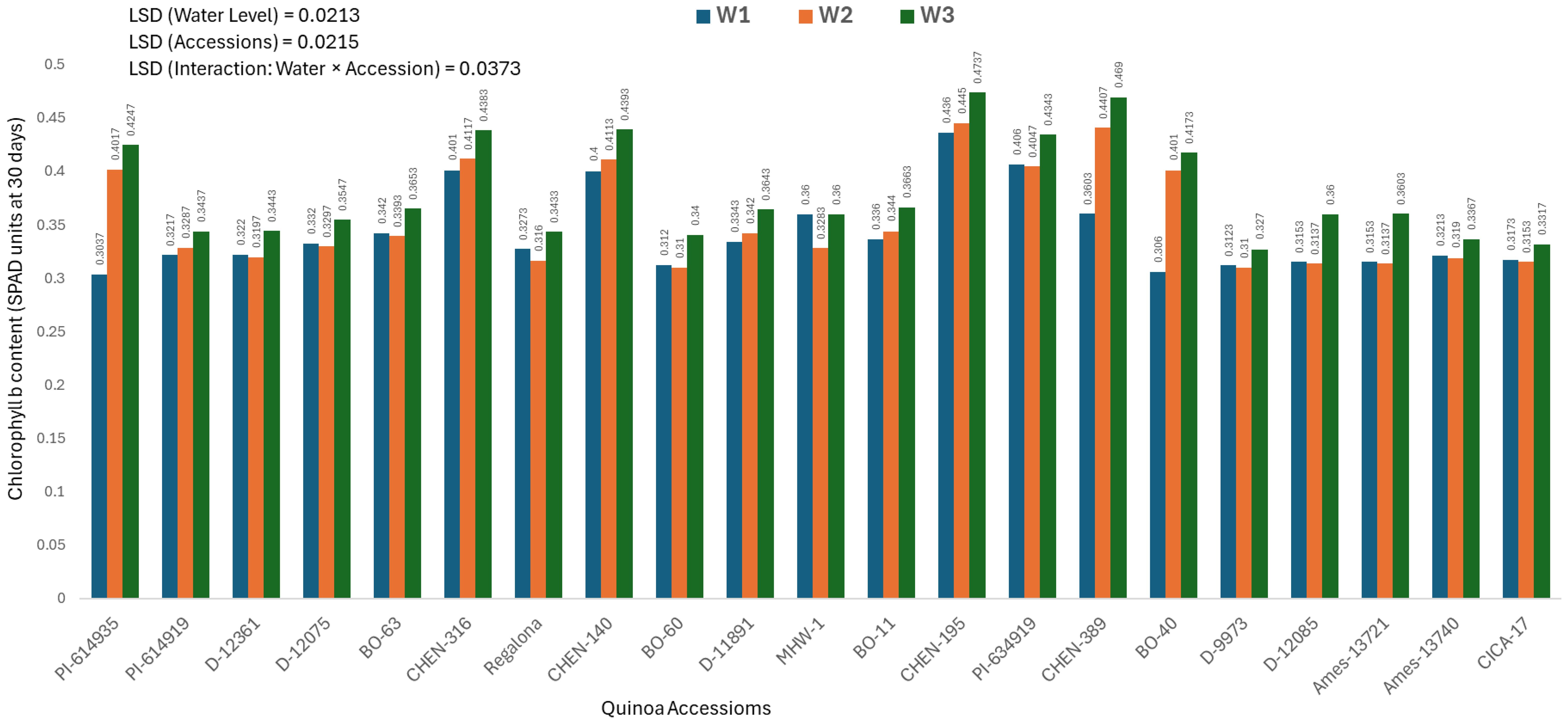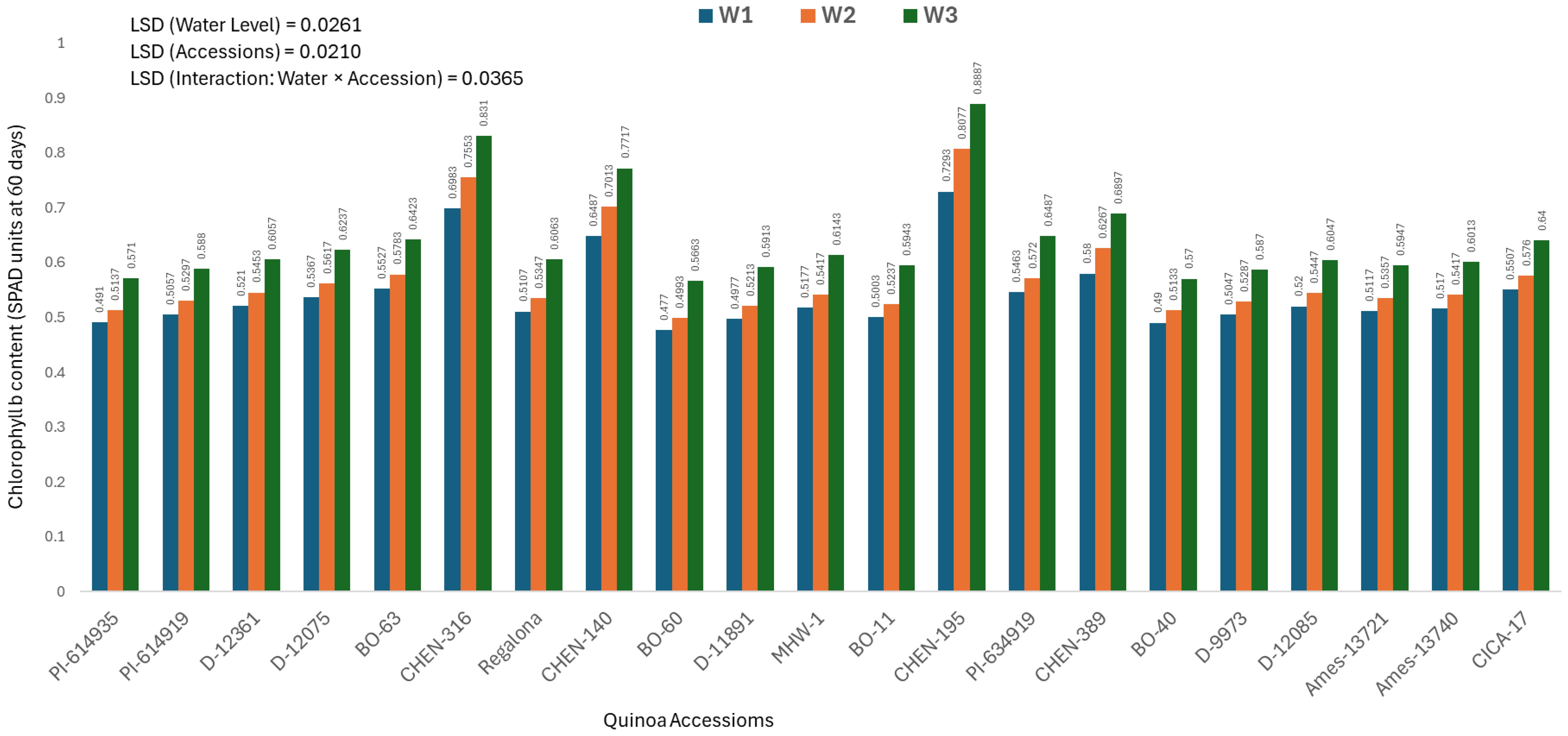 The chlorophyll b content measured at 60 days varied significantly across quinoa accessions, irrigation regimes, and their interaction. As the interaction was significant, only genotype × irrigation combinations are discussed below. The highest chlorophyll b value was recorded in ‘CHEN-195’ under W3 (5 minutes twice daily; 0.5533 ± 0.0125 mg/100g), followed by ‘CHEN-195’ × W2 (0.5187 ± 0.0125 mg/100g) and ‘CHEN-140’ × W3 (0.5140 ± 0.0125 mg/100g), indicating their superior ability to preserve chlorophyll pigments during the critical mid-growth stage (Figure 5). These findings reinforce the stability of these genotypes in maintaining photosynthetic activity under water-limited conditions, in agreement with Morales et al. (2022) and Kiani et al. (2021). In contrast, the lowest chlorophyll b levels were recorded in ‘BO-60’ under W2 and W1 (0.3377 ± 0.0125 and 0.3403 mg/100g, respectively), suggesting limited pigment biosynthesis or accelerated degradation in this genotype under drought. Similarly, ‘PI-614935’ and ‘BO-40’ showed poor chlorophyll retention under moderate and severe stress. Genotypes like ‘CHEN-195’, ‘CHEN-140’, and ‘CHEN-316’ demonstrated strong pigment preservation and could serve as valuable resources for enhancing drought resilience in breeding programs. These findings confirm that chlorophyll b content is a reliable physiological marker for selecting drought-tolerant quinoa cultivars (Ruiz et al., 2023; Hinojosa et al., 2018).