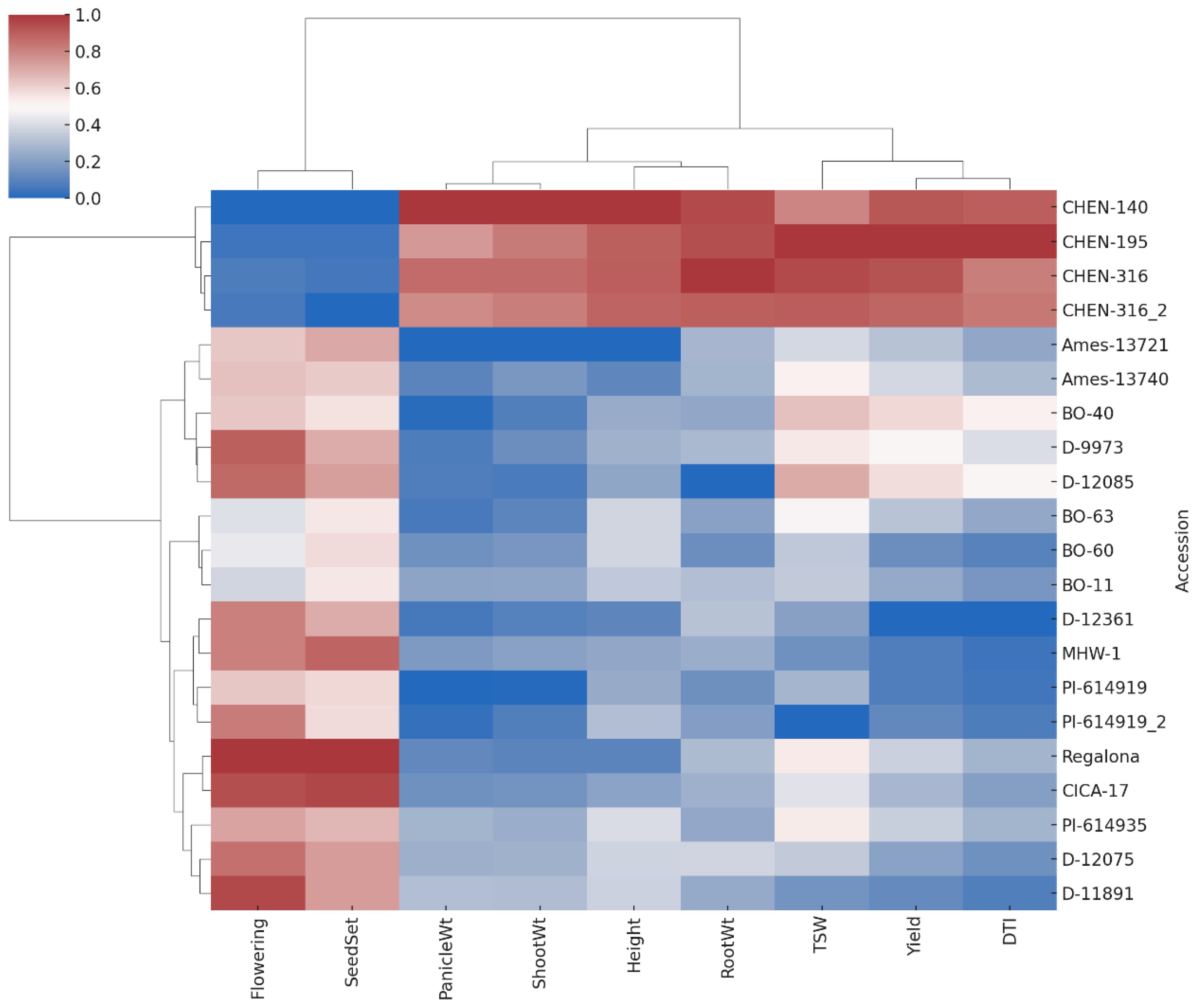 Figure 8. Heatmap with hierarchical clustering of standardized trait values for 21 quinoa accessions across nine agronomic and yield traits. Accessions and traits were clustered using Ward’s method and Euclidean distance. Red shades indicate higher trait values, while blue shades indicate lower values. Clustering reveals groupings of accessions with similar performance profiles under arid conditions.