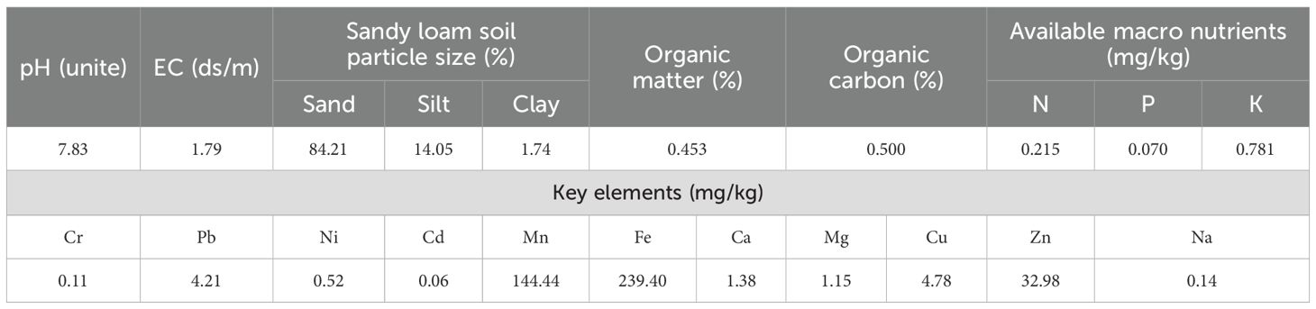 This study was conducted at the Agricultural Research Station of King Abdulaziz University in Hada Al-Sham, situated in the western region of Saudi Arabia (21.7961° N, 39.7256° E). The site experiences an arid climate, characterized by low and highly variable annual rainfall (ranging from 50 to 100 mm), elevated temperatures, and sandy-loam soil with limited water-holding capacity and low organic matter. The soil pH measured 7.8, and electrical conductivity (EC) was 1.79 dS/m, indicating moderately saline conditions. Detailed soil characteristics are presented in Table 1. These environmental features are typical of dryland farming systems across the Arabian Peninsula (Odokonyero et al., 2024), making the site ideal for evaluating crop responses under water-limited conditions.