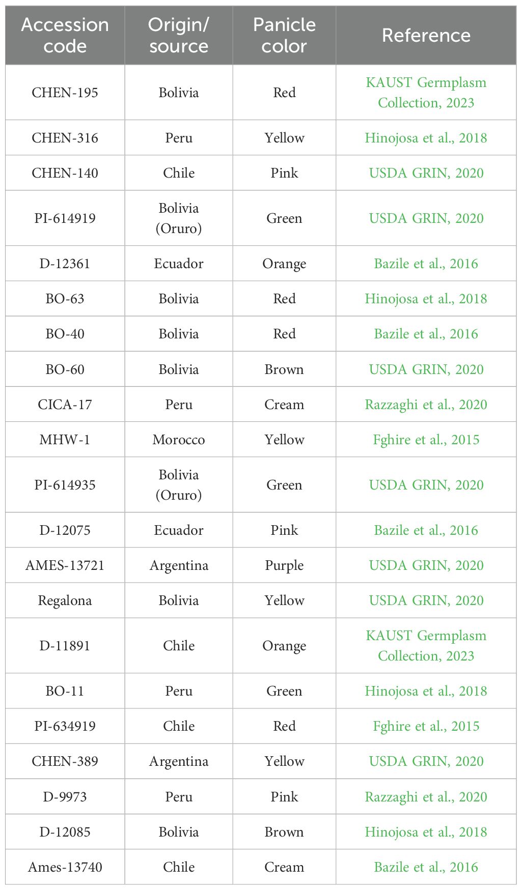 A total of 21 quinoa (Chenopodium quinoa Willd.) accessions were evaluated in this study. The accessions were generously provided by Prof. Mark Tester from King Abdullah University of Science and Technology (KAUST). The accessions were sourced from international and regional germplasm collections, including varieties adapted to a wide range of environments. These genotypes represent a diverse range of geographical origins and genetic backgrounds, and they differ in morphological traits such as panicle color and growth habit. This genetic diversity offered a robust framework for assessing performance under contrasting irrigation regimes. Detailed descriptions of the accessions, including their origins and panicle coloration, are listed in Table 2 (Jiang et al., 2022).