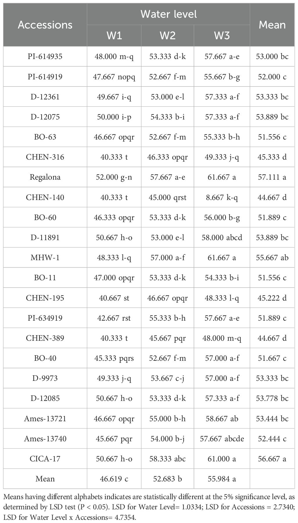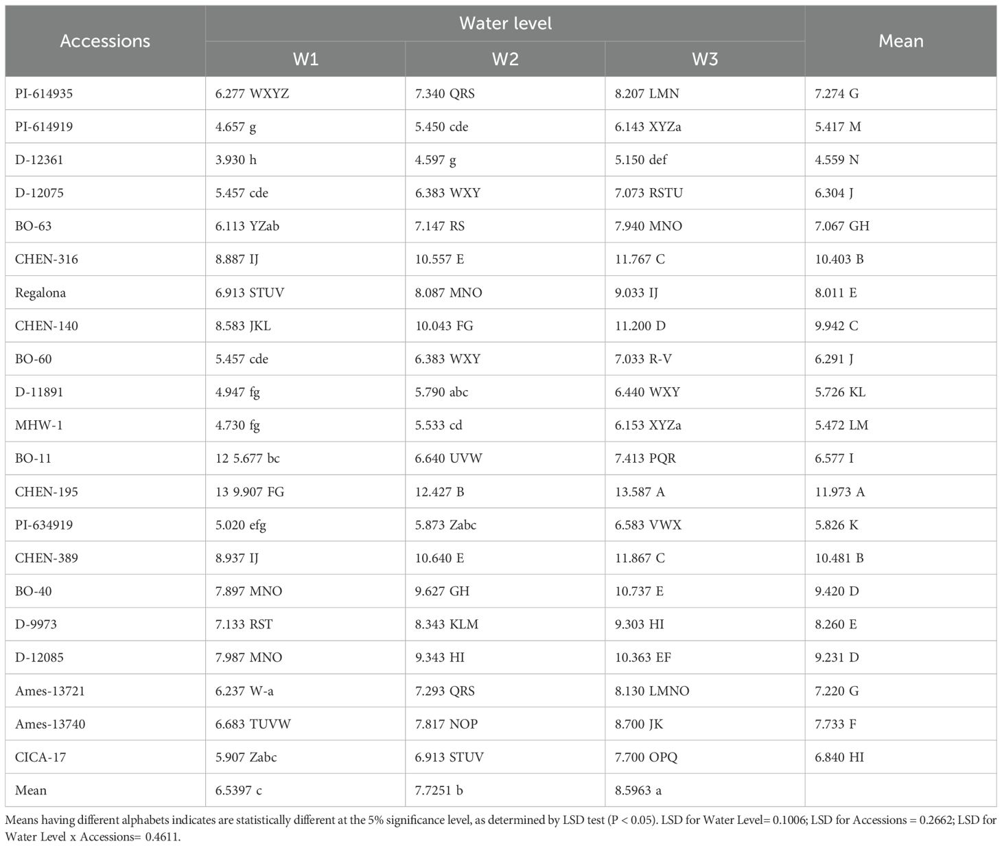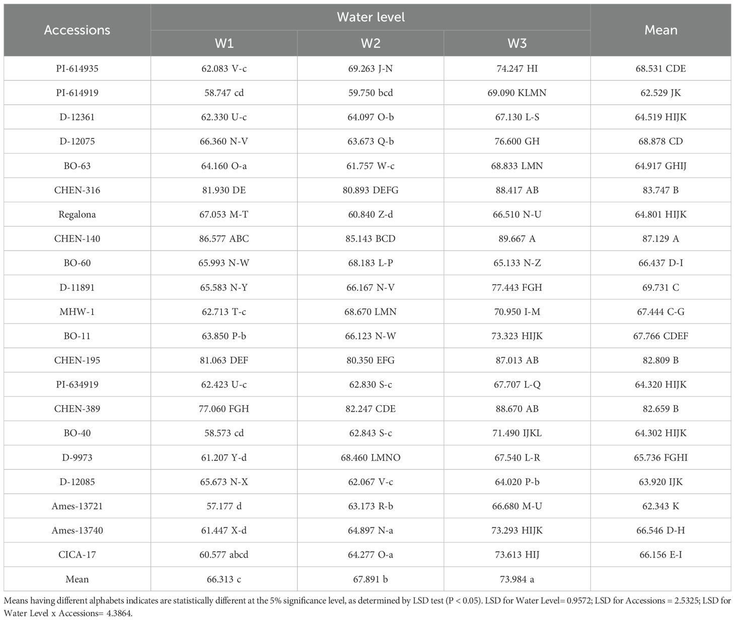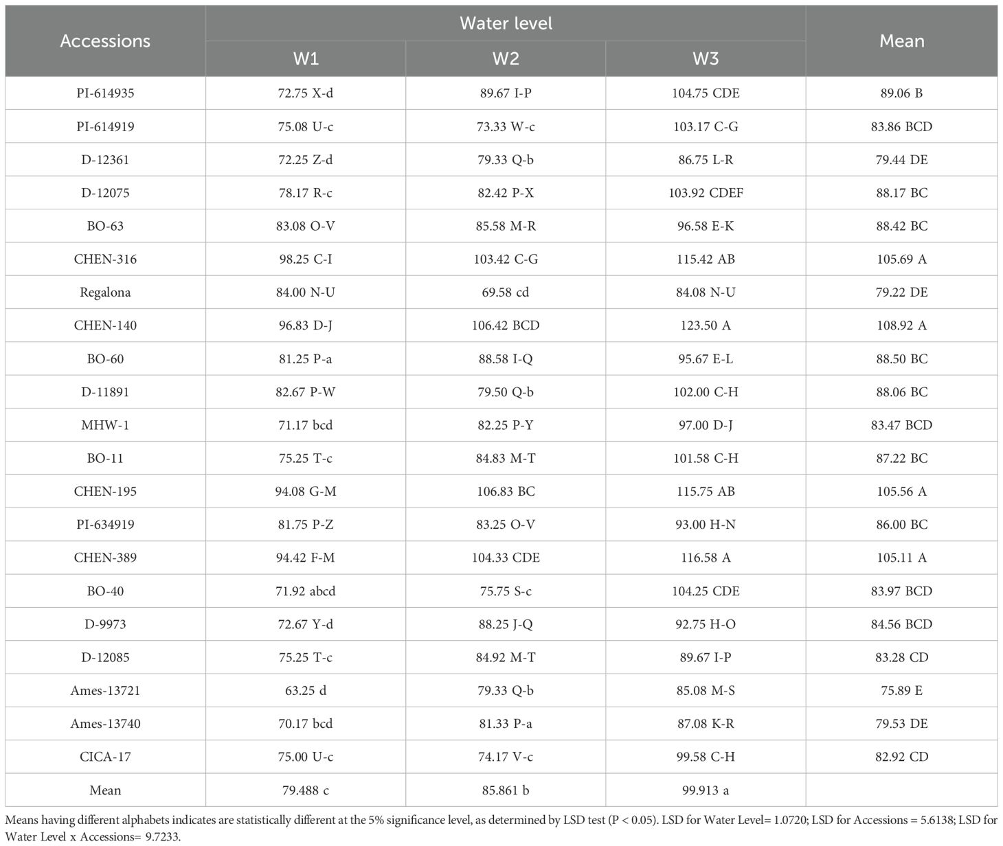 The weight of 1000 seeds is a key yield component that reflects seed development and is influenced by both genetic and environmental factors. In this study, significant variation was observed among accessions and water regimes for 1000-seed weight. However, the interaction effect between genotype and irrigation was not significant, indicating consistent seed weight responses across irrigation treatments.