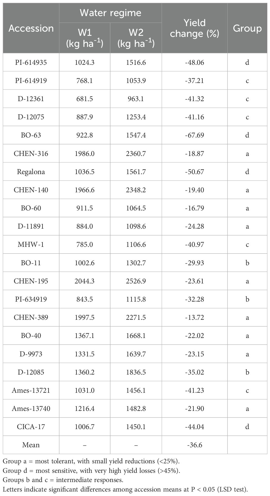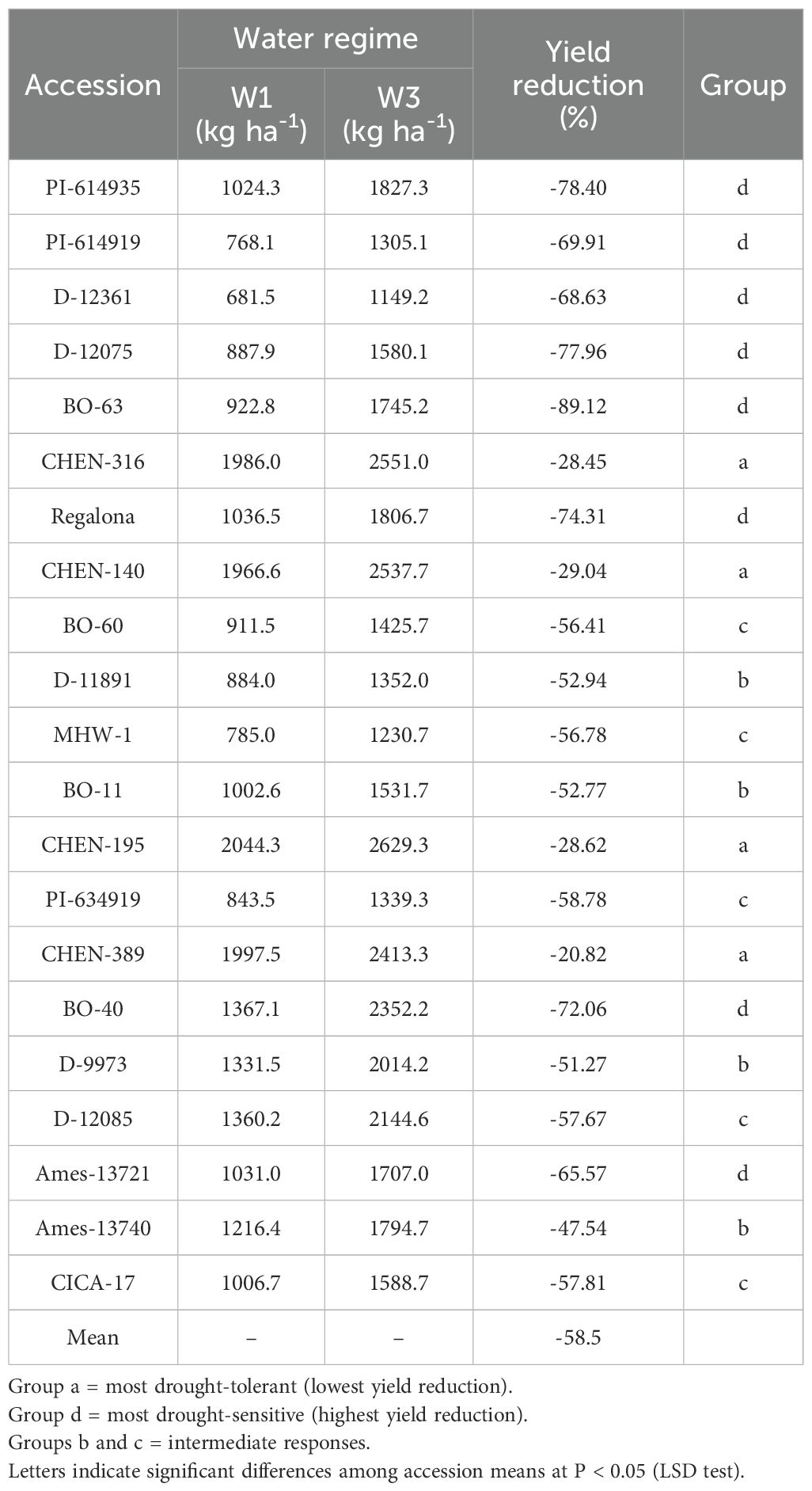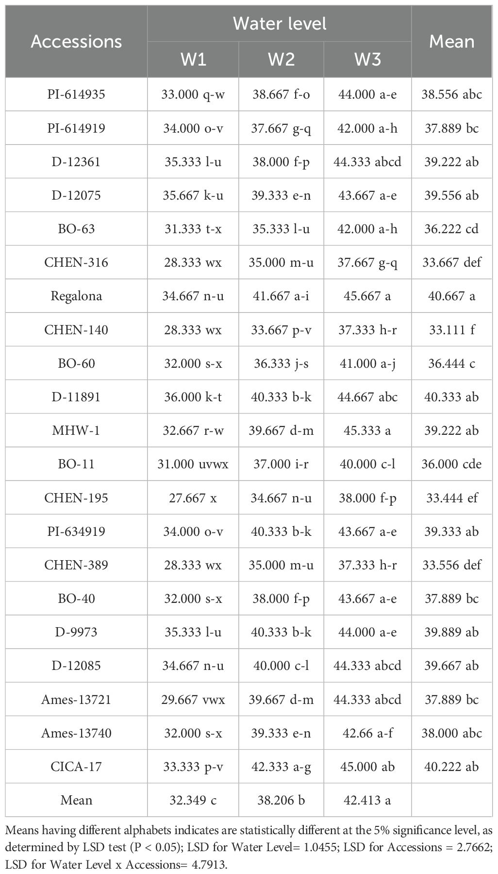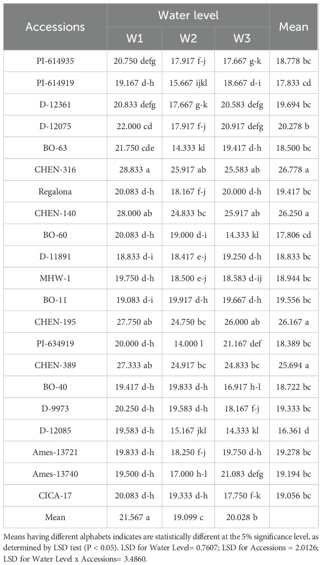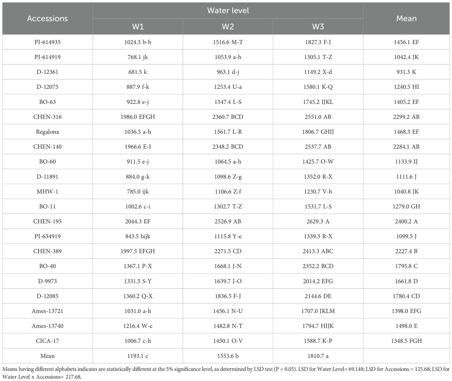 The weight of 1000 seeds is a key yield component that reflects seed development and is influenced by both genetic and environmental factors. In this study, significant variation was observed among accessions and water regimes for 1000-seed weight. However, the interaction effect between genotype and irrigation was not significant, indicating consistent seed weight responses across irrigation treatments.