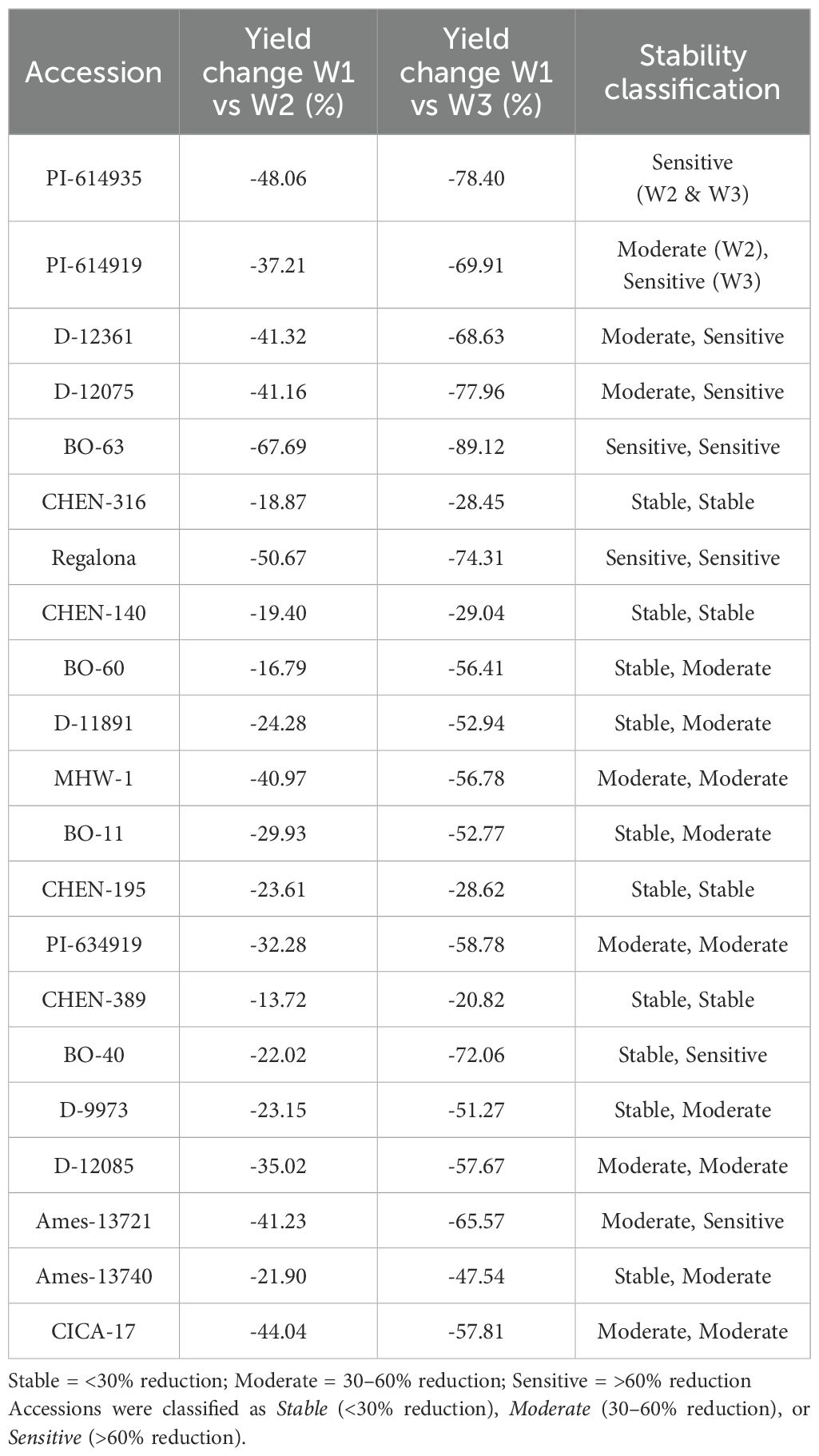 The percentage reduction in seed yield per hectare varied significantly across genotypes, irrigation regimes, and their interaction. As the interaction was significant, only genotype × irrigation combinations are reported. Under severe water stress (W3: 5 minutes twice daily), the highest yield reductions were observed in ‘BO-63’ (–89.1%), followed by ‘PI-614935’ (–78.4%), ‘D-12075’ (–78.0%), and ‘Regalona’ (–74.3%), indicating high sensitivity to drought. Other accessions, such as ‘BO-40’ (–72.1%) and ‘PI-614919’ (–69.9%), also experienced substantial declines under W3 (Table 11 and Table 12). In contrast, accessions including ‘CHEN-316’ (–28.5%), ‘CHEN-140’ (–29.0%), and ‘CHEN-195’ (–28.6%) exhibited the smallest yield penalties, demonstrating superior drought tolerance. At the moderate irrigation level (W2: 10 minutes twice daily), yield reductions were smaller but still varied among genotypes. The most tolerant accessions were ‘CHEN-316’ (–18.9%), ‘CHEN-140’ (–19.4%), and ‘CHEN-316_2’ (–13.7%), whereas the most sensitive were ‘BO-63’ (–67.7%), ‘Regalona’ (–50.7%), and ‘PI-614935’ (–48.1%). Overall, the mean reduction across accessions was –36.6% under W2 and –58.5% under W3, confirming the wide range of adaptive responses among quinoa genotypes (Table 13). These results align with previous findings that drought stress significantly limits quinoa yield, especially in less-adapted genotypes (Bazile et al., 2016; Hinojosa et al., 2018; Razzaghi et al., 2020). Genotypes showing lower yield reductions under W2 and W3, such as ‘CHEN-316’ and ‘CHEN-195’, are promising candidates for cultivation in arid regions where efficient irrigation management is critical (Stanschewski et al., 2021; Hafeez et al., 2022).