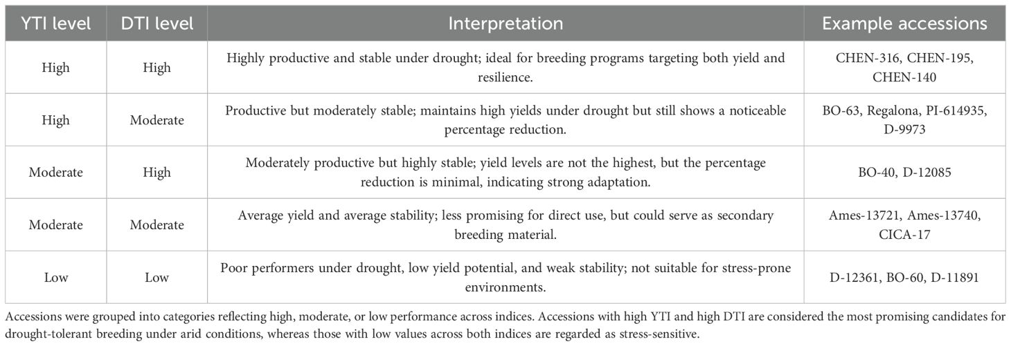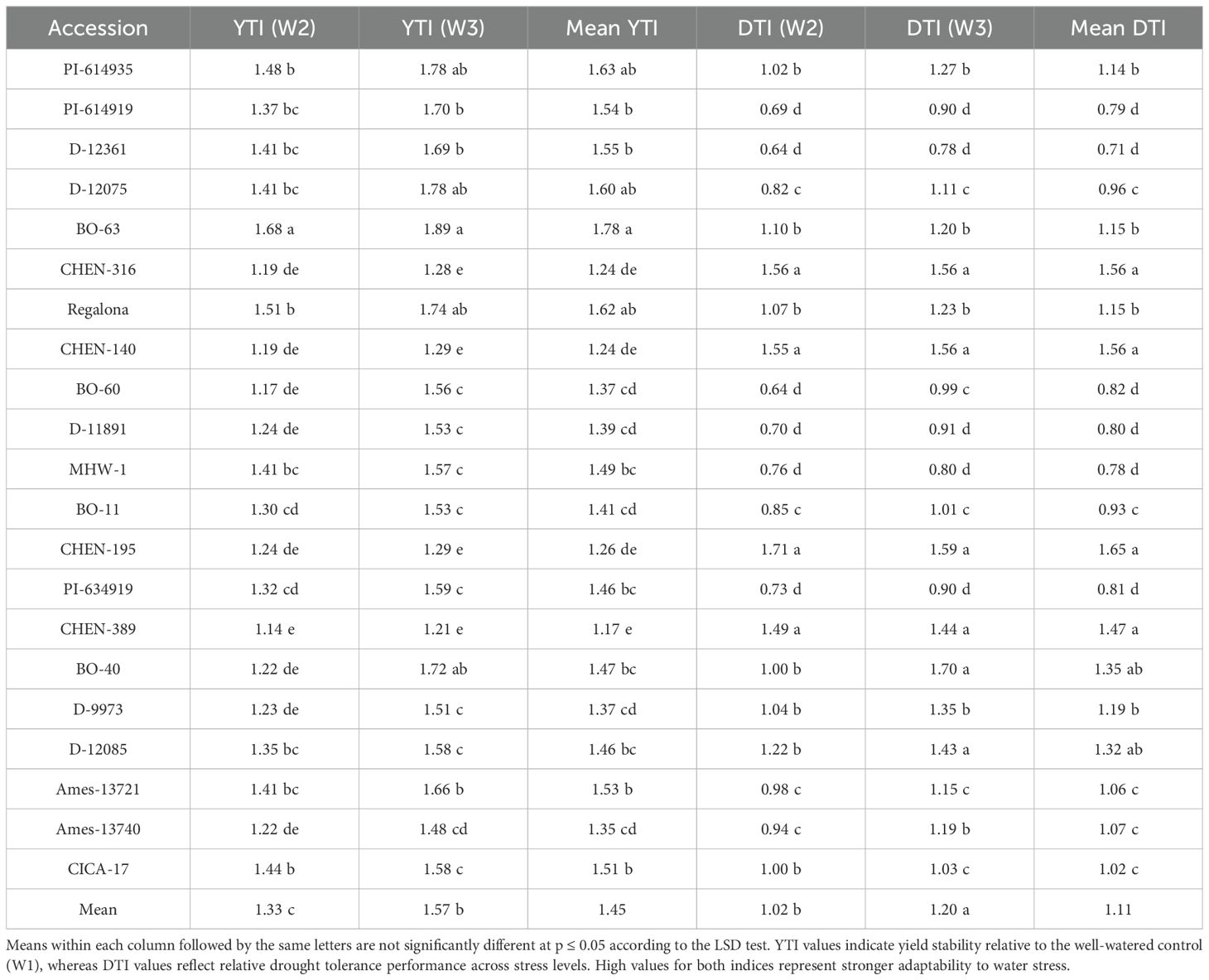 The Drought Tolerance Index (DTI) quantifies the relative performance of a genotype under water stress compared with optimal irrigation, with values typically ranging from 0 to 1; higher values indicate stronger yield stability and superior drought tolerance, whereas lower values reflect greater susceptibility to drought-induced yield losses. The drought tolerance index (DTI) showed significant variation among quinoa accessions, irrigation regimes, and their interaction. Because the interaction was significant, only genotype × irrigation combinations are presented to highlight how different accessions respond under varying irrigation intensities. The highest DTI was observed for ‘CHEN-195’ under W1 (15 minutes twice daily; 2.4843), followed by ‘CHEN-140’ (2.3163) and ‘CHEN-316’ (2.2277), indicating their superior resilience under mild drought stress (Table 15). These accessions are known for their stable grain filling and enhanced physiological tolerance mechanisms such as osmotic adjustment and stomatal regulation under water-limited conditions (Kiani et al., 2021; Morales et al., 2022). In contrast, accessions such as ‘D-12361’ and ‘PI-614919’ exhibited low DTI values (0.2518 and 0.3194, respectively), suggesting a poor capacity to maintain yield under drought stress. The zero DTI values observed under W3 (5 minutes twice daily) across all accessions underscore the critical threshold of water availability required for quinoa survival and productivity, echoing the thresholds reported by Razzaghi et al. (2020) and Ruiz et al. (2023). These findings highlight the genetic variation in drought adaptation and reinforce the suitability of ‘CHEN-195’, ‘CHEN-316’, and ‘CHEN-140’ as drought-resilient cultivars for arid and semi-arid environments. Such accessions have been repeatedly noted for their agronomic performance under stress due to favorable traits like deep rooting, leaf retention, and photosynthetic stability (Hinojosa et al., 2018; Bazile et al., 2016).