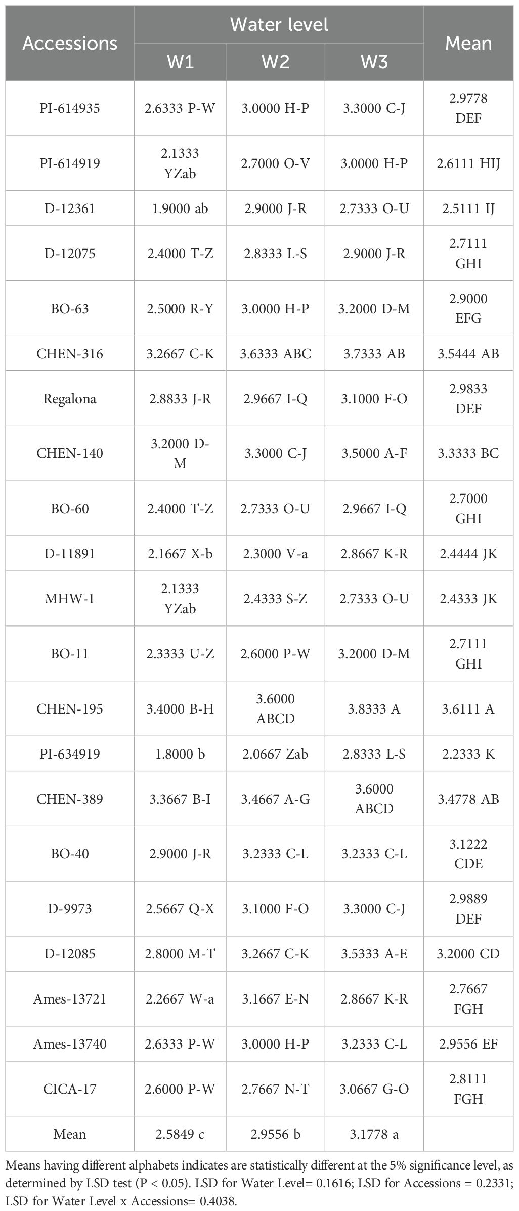 Shoot, panicle, and root dry weights were all significantly influenced by irrigation regime, genotype, and their interaction (Tables 6, 7, 8). Across traits, the general trend was W1 > W2 > W3, reflecting the positive effect of higher water availability on biomass accumulation. However, notable genotypic differences emerged. Accessions ‘CHEN-140’ and ‘CHEN-316’ consistently recorded the highest shoot (89.67 and 88.67 g, respectively) and panicle dry weights (>47 g) under W1, indicating superior vegetative vigor and reproductive investment under optimal irrigation. In contrast, ‘AMES-13721’ and ‘PI-614919’ were among the lowest performers under W3 across all three biomass traits. Root biomass also followed the same irrigation trend, with ‘CHEN-316’ and ‘CHEN-140’ producing the highest values under W1, while maintaining relatively higher root dry weight under W3. This suggests deeper or more efficient root systems, a trait associated with drought resilience (Geerts et al., 2008). The consistency of CHEN accessions in maintaining superior shoot, panicle, and root dry weights under stress aligns with previous findings (Razzaghi et al., 2020; Bazile et al., 2016), highlighting their adaptability and potential as parents in breeding for drought-prone environments.