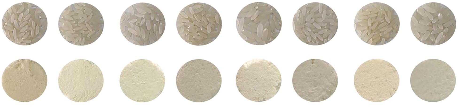 Figure 1. Images of samples to be tested (Rice origins from left to right: Dehui, Gongzhuling, Huadian, Shulan, Taoer River, Yitong, Yushu, Zhenlai).