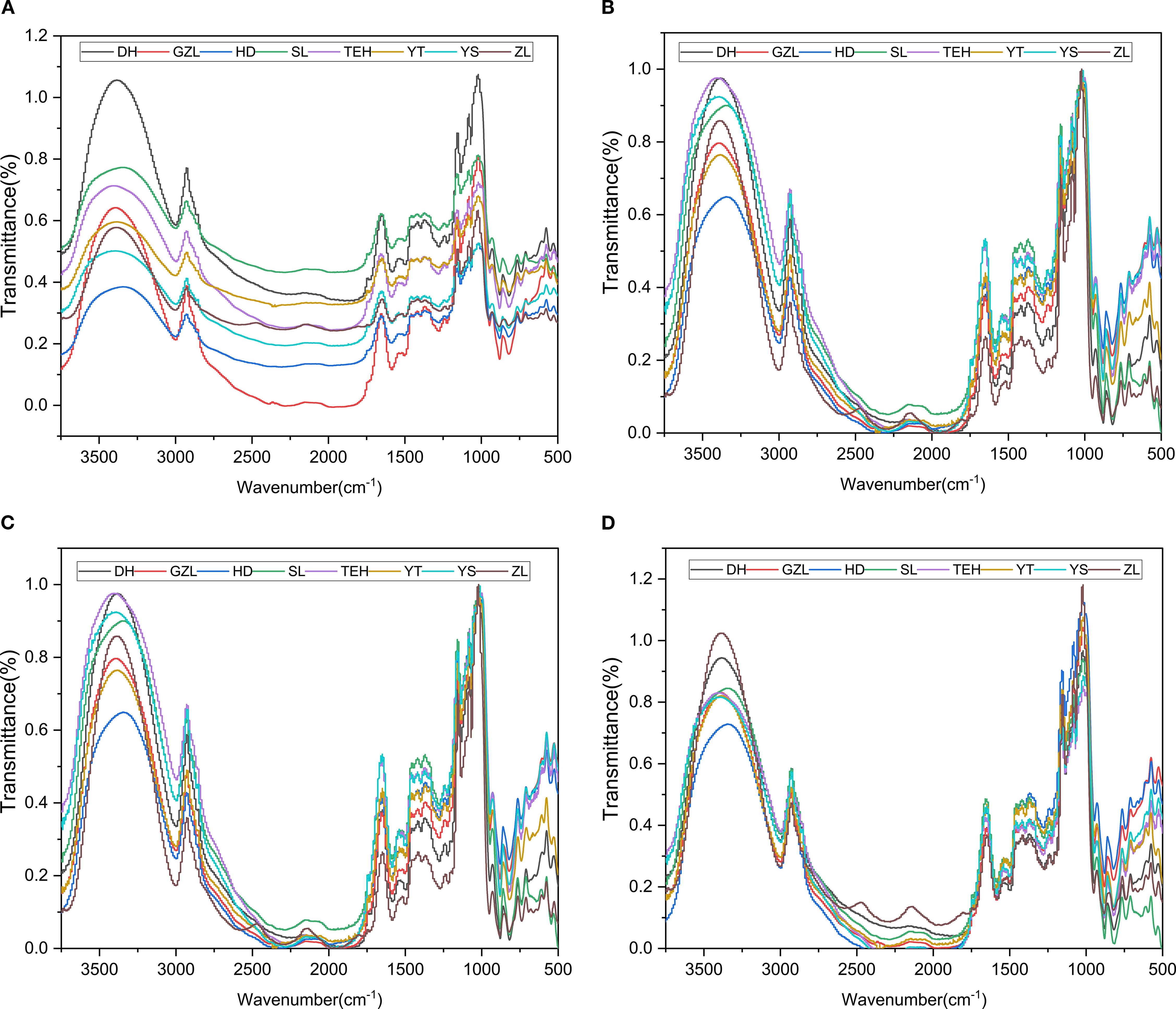 To visually display the differences in rice spectral data from different origins, the average spectral data for rice samples from each origin were calculated, and a comparison chart of average spectral data between regions was plotted (see Figure 2). (Figure 2a) shows the raw MIR spectra of the samples, generated by molecular vibrational transitions. Given the significant noise in spectral data below 500 cm-1 and above 3750 cm-1, this study specifically selected the 500–3750 cm-1 band as effective spectral data for analysis, as detailed in Figure 2. Due to the complexity and severe overlap of bands in the IR region, preprocessing methods were employed to effectively extract sample information. Specific results are shown in (Figure 2b) Normalization, (Figure 2c) Normalization-SG smoothing filter, and (Figure 2d) Normalization-MSC scatter correction. Comparing (Figure 2b) with (Figures 2c, d), it can be observed that the spectra processed with smoothing and scatter correction are smoother than the original spectra, and the differences between the spectral curves are significantly reduced. This indicates that MSC preprocessing effectively corrected spectral errors caused by scattering phenomena during spectral acquisition.