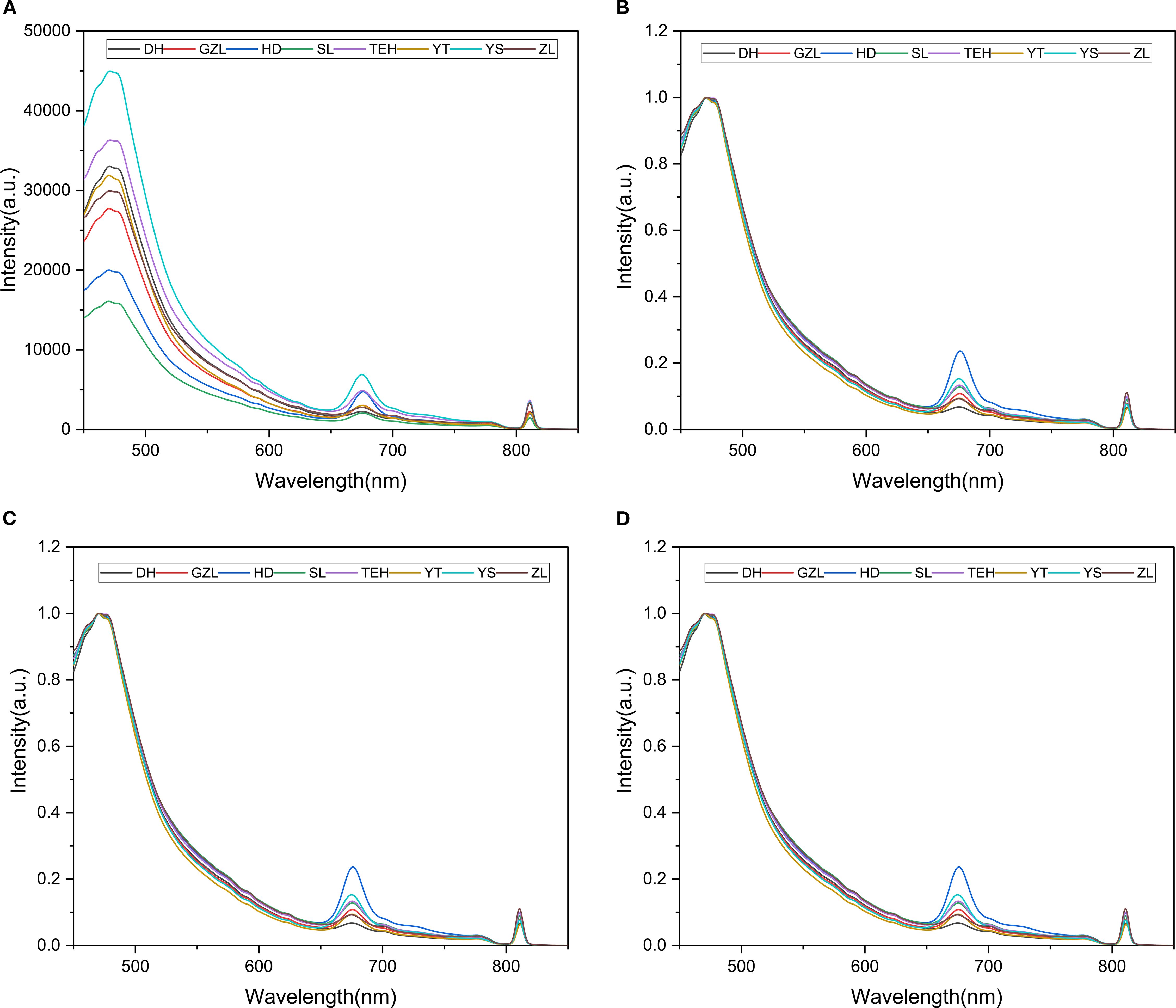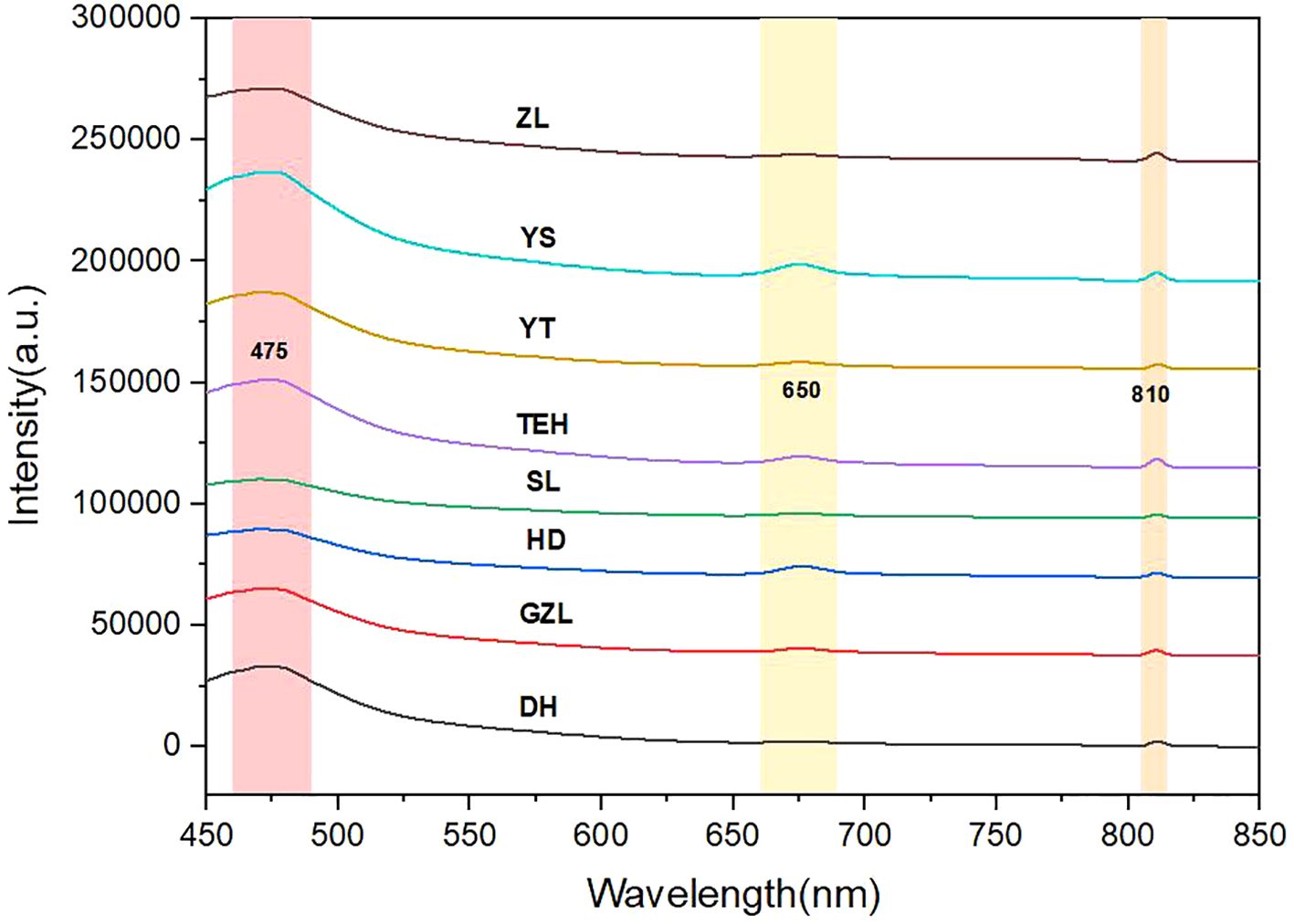 The main components of rice, such as starch and protein, exhibit different vibrational spectral characteristics due to differences in chemical composition, content, and structure. Significant fluorescence characteristic peaks were observed particularly in the wavelength intervals of 475–525 nm, 550–600 nm, and 650–690 nm. During analysis, it cannot be assumed that a FLU spectral peak originates from a single substance solely based on its position, as some peaks may result from mixtures of multiple substances.