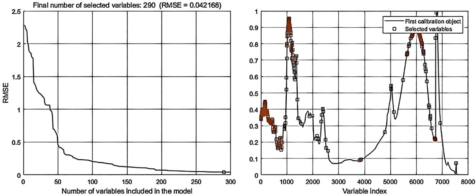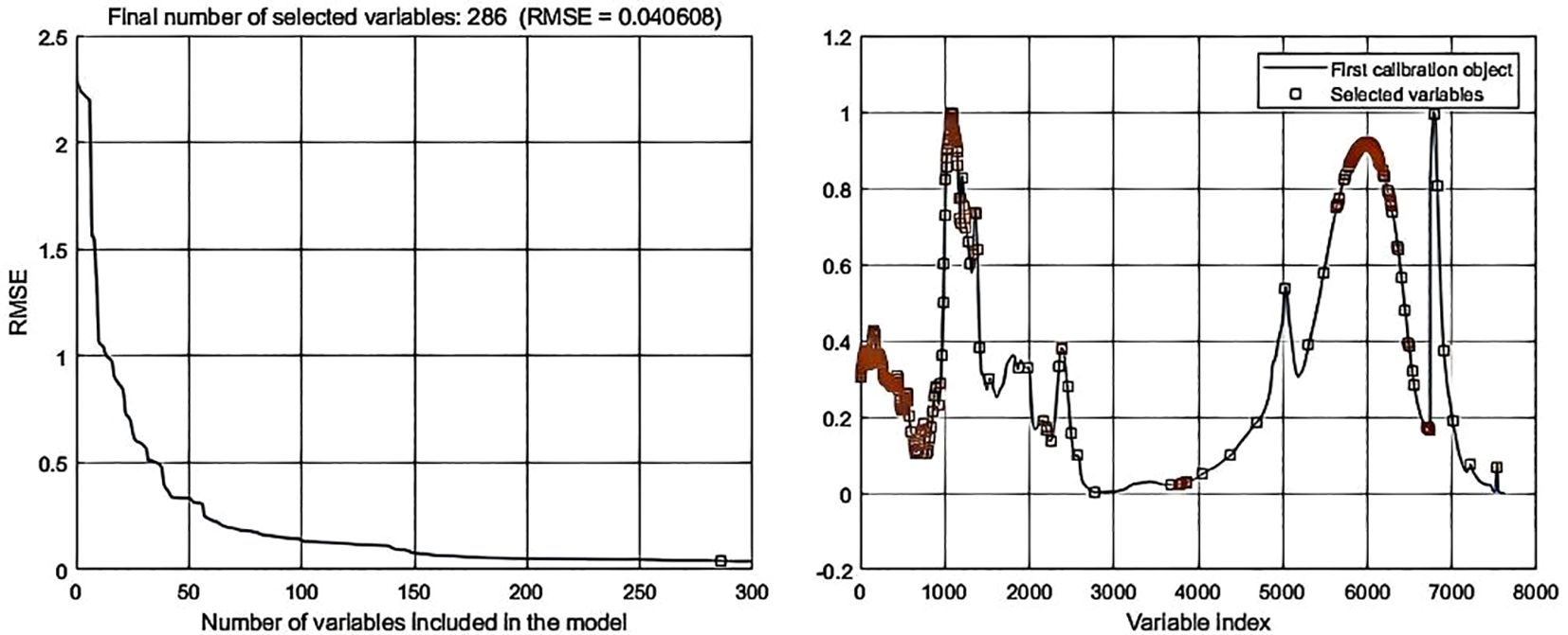 Figure 7. SPA error analysis and feature selection distribution for data-level fusion with Normalization-MSC preprocessing.