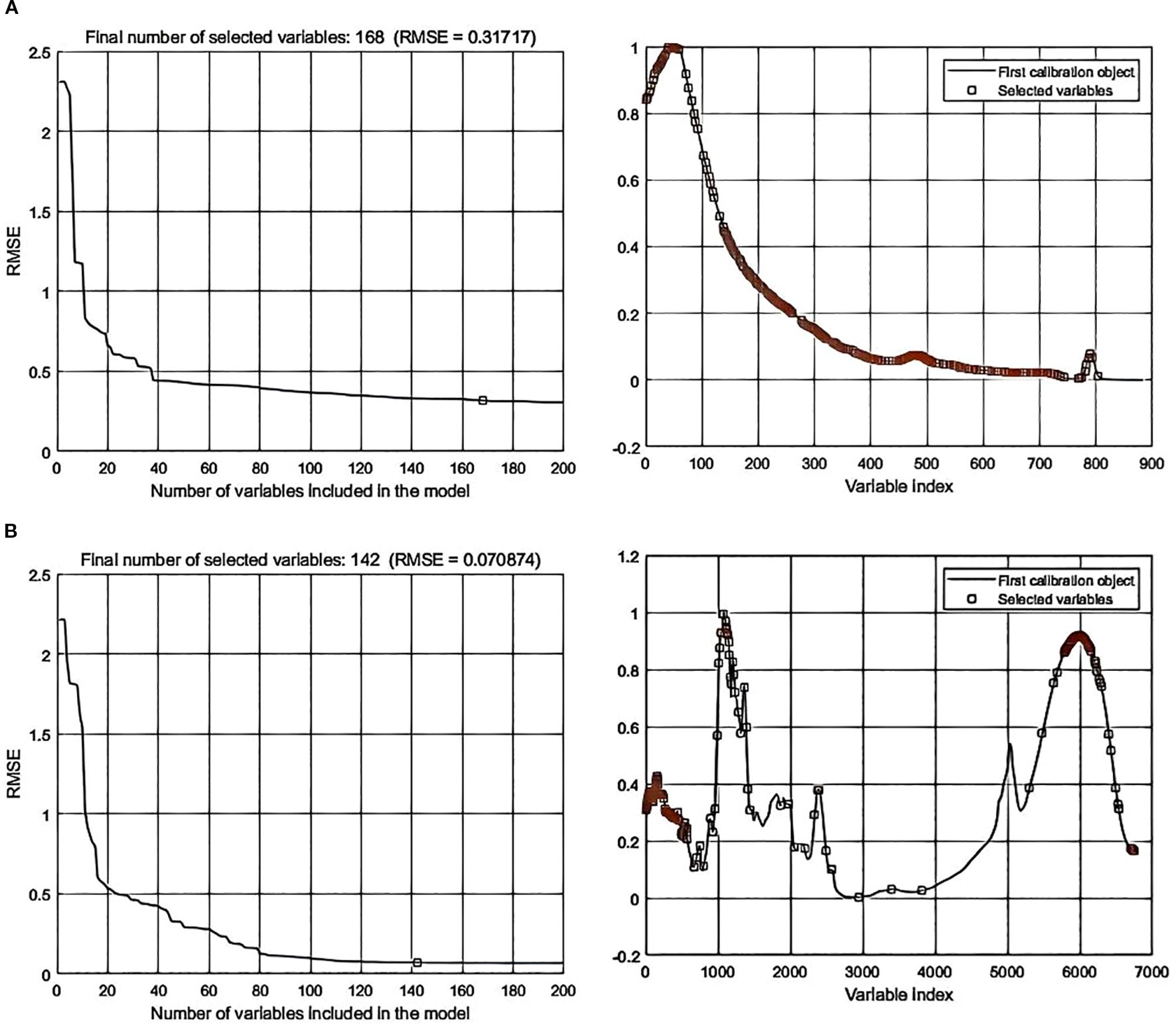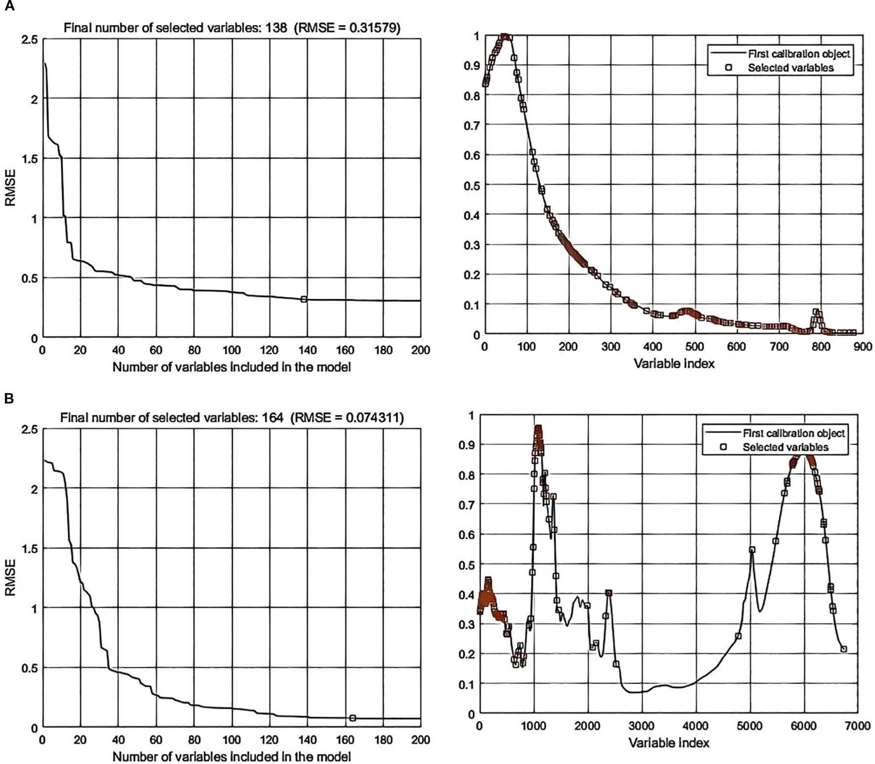 Figure 9. SPA error analysis and feature selection distribution for feature-level fusion with Normalization-MSC preprocessing. (a) Fluorescence spectra; (b) Mid-infrared spectra.