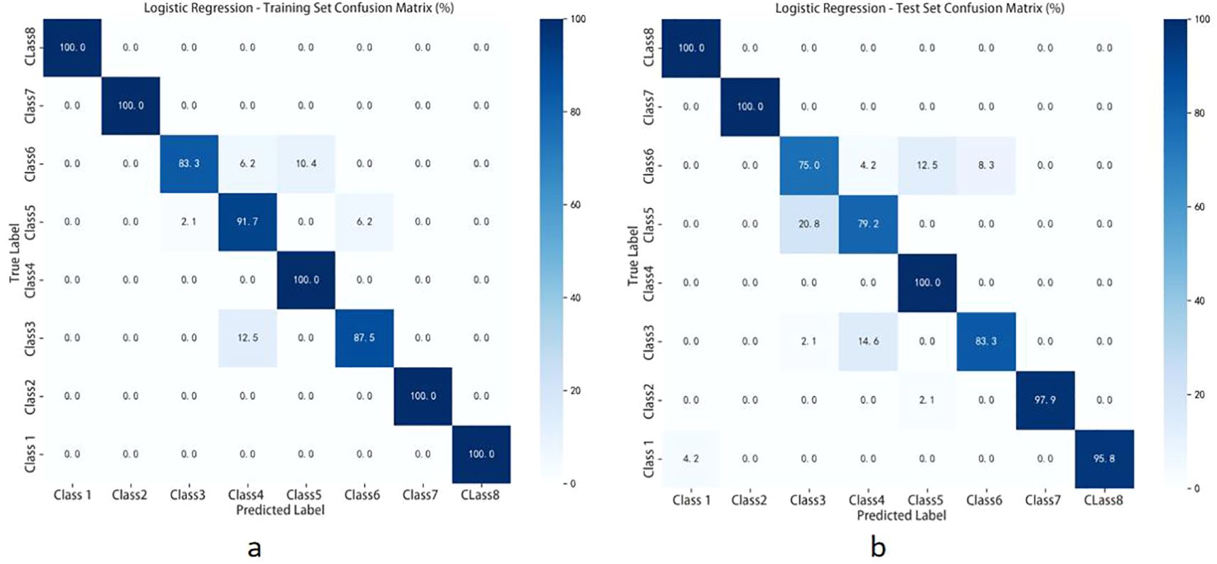 Figure 10. Shows the confusion matrix results of the test set: (a) classification performance of the logistic regression (LR) model under data-level fusion mode; (b) classification performance of the logistic regression (LR) model under feature-level fusion mode.