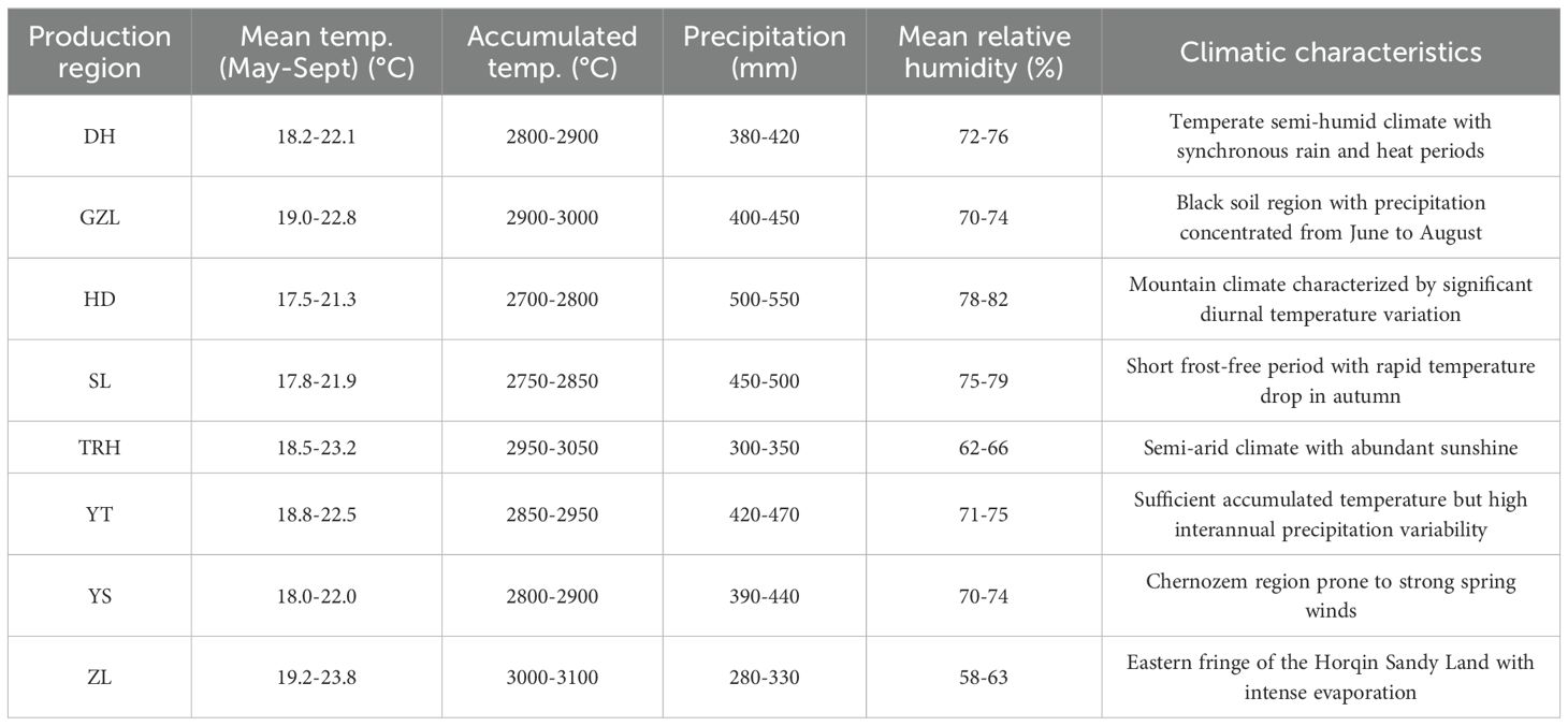 Table 1. Climatic characteristics of production regions including average temperature, accumulated temperature, precipitation, and mean relative humidity.