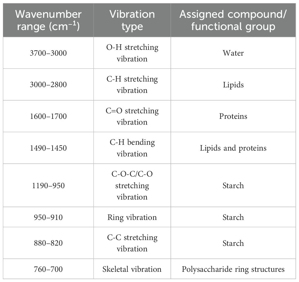 FTIR analysis indicated that rice powder displayed characteristic absorption peaks within the 500–3750 cm-1 range, closely related to molecular vibrations of its main components (starch, protein, lipids, and water molecules) (Figure 3). The specific assignments of the absorption peaks are as follows: The broad and strong absorption band observed in the 3700–3000 cm-1 range (centered around 3500 cm-1) is primarily attributed to the O-H stretching vibration of water molecules and the N-H stretching vibration of the protein amide A band. The characteristic peaks in the 3000–2800 cm-1 range (around 2900 cm-1) correspond to the asymmetric and symmetric C-H stretching vibrations of methylene (CH2) groups in lipids, indicating the presence of long-chain fatty acids. The characteristic peaks observed around 1600–1700 cm-1 and 1490–1450 cm-1 correspond to the protein amide I band (C=O stretching vibration) and amide II band (N-H bending vibration/C-N stretching vibration) (Zhang et al., 2023b), respectively. These peaks may overlap with the O-H bending vibration of starch. The strong absorption band in the 1190–950 cm-1 range is characteristic of starch, where the peak around 1150 cm-1 is assigned to C-O-C stretching vibration, and the multiple peaks in the 1000–1090 cm-1 range correspond to C-O-H stretching vibrations. These characteristic peaks are closely related to the crystallinity and molecular structure of starch (Lian et al., 2013). In the 900–500 cm-1 range, the characteristic peak around 950–910 cm-1 can be attributed to the ring vibration of the α-1,4 glycosidic bond in starch, while the weak peak around 760–700 cm-1 may be related to the skeletal vibrations of polysaccharides. Table 2 summarizes the assignment results of the key absorption peaks in the mid-infrared spectrum of rice powder.