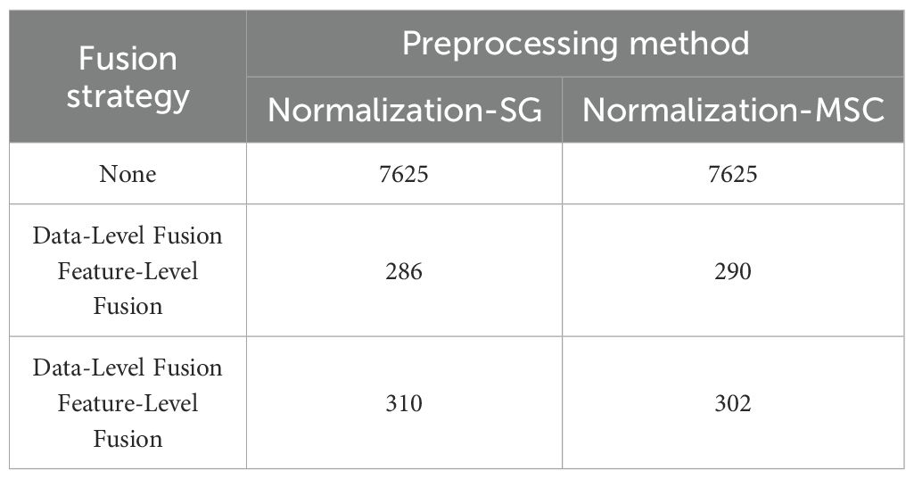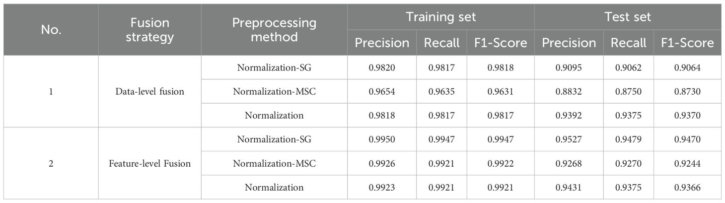 Experimental results revealed notable differences in optimal preprocessing methods under different fusion strategies (Table 4). For data-level fusion, both Normalization-SG and Normalization-MSC achieved excellent training performance (Precision > 0.99). However, on the test set, Normalization-SG significantly outperformed Normalization-MSC across all metrics (Precision: 0.9095 vs. 0.8832; Recall: 0.9062 vs. 0.8750; F1-score: 0.9064 vs. 0.8730).