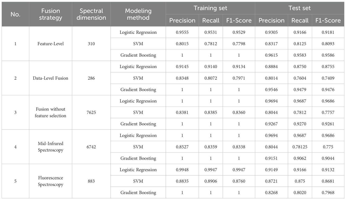 LR demonstrated robustness and accurate classification in both fusion modes, making it particularly suitable for medium-to-low dimensional spectral data. SVM was more sensitive to parameters and feature scaling, and its performance was not fully realized without parameter tuning.