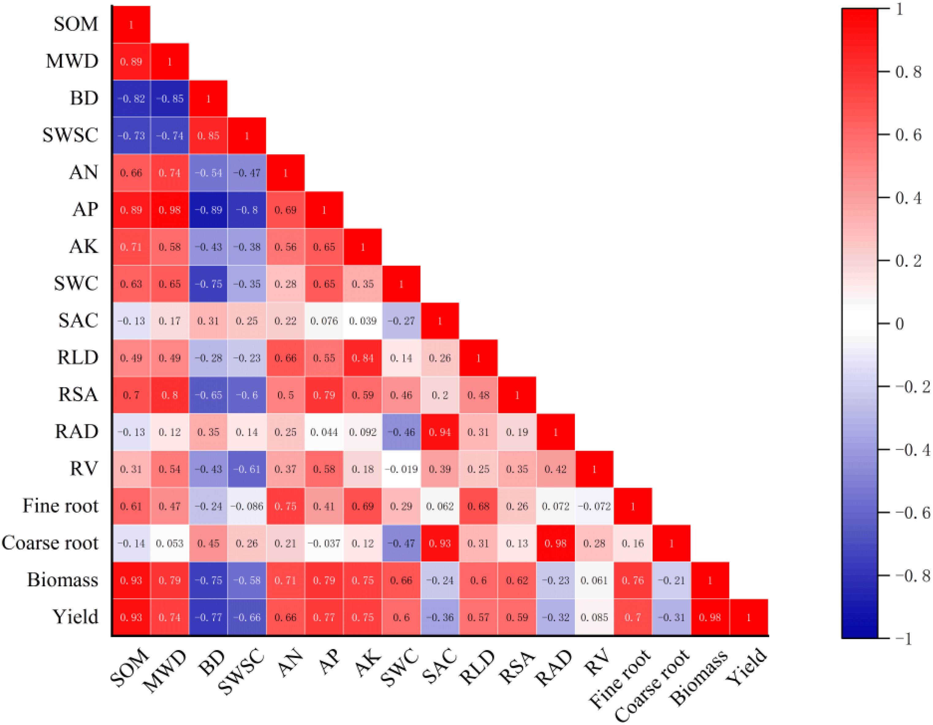 Figure 9. Relationships between cotton growth parameters and soil properties in 2021. SOM, soil organic matter; MWD, mean weight diameter; BD, bulk density; SWSC, soil water storage capacity; AN, alkali hydrolyzed nitrogen; AP, available phosphorus; AK, available potassium; SWC, soil water content; SAC, soil salt content; RLD, root length density; RSA, root surface area; RV, root volume; RAD, root average diameter. Values in layout indicate the correlation coefficient.