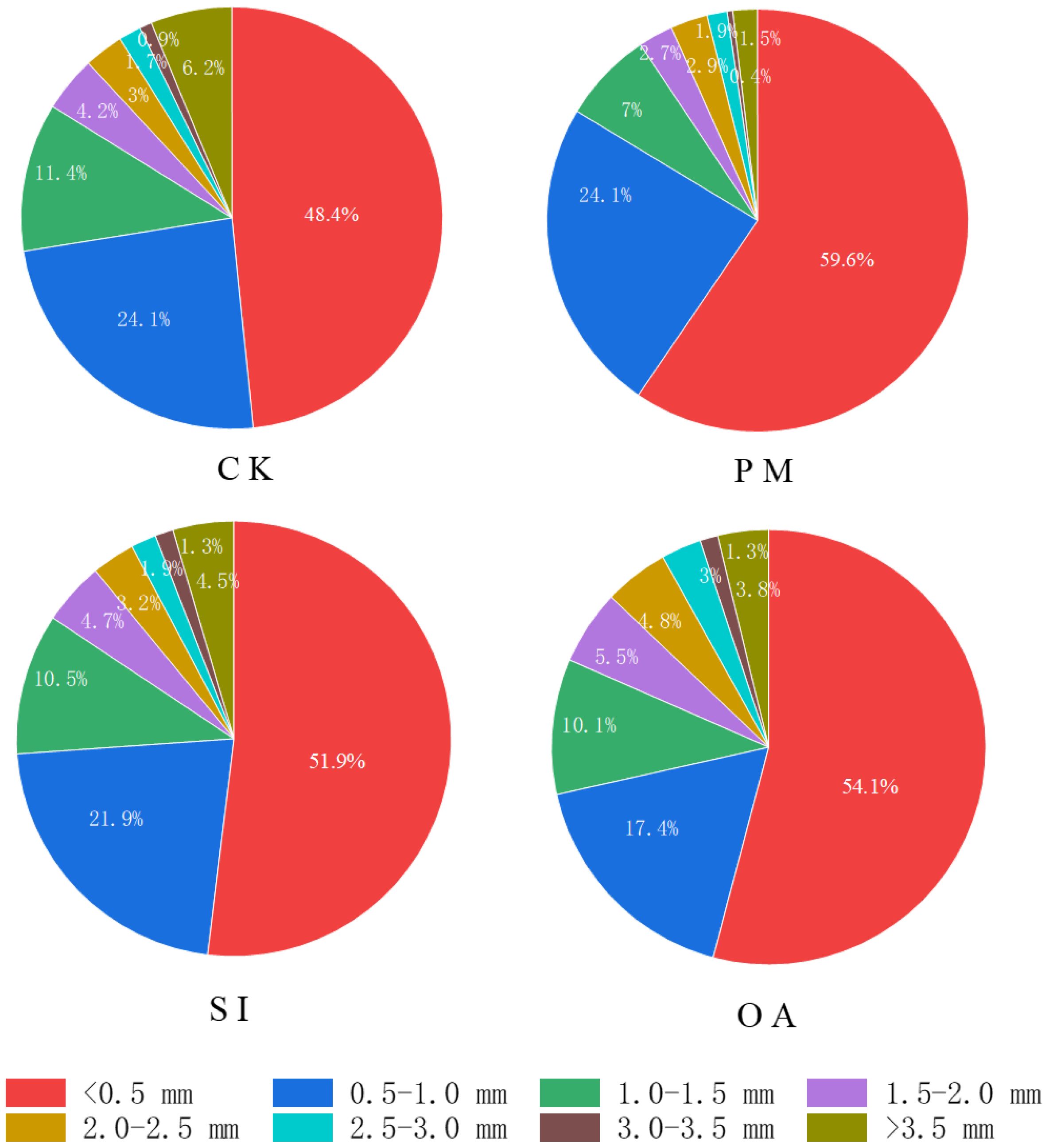Figure 11. The percentage of different root diameters under the control (CK), plastic mulching (PM), straw interlayer (SI), and organic amendment (OA) in topsoil.