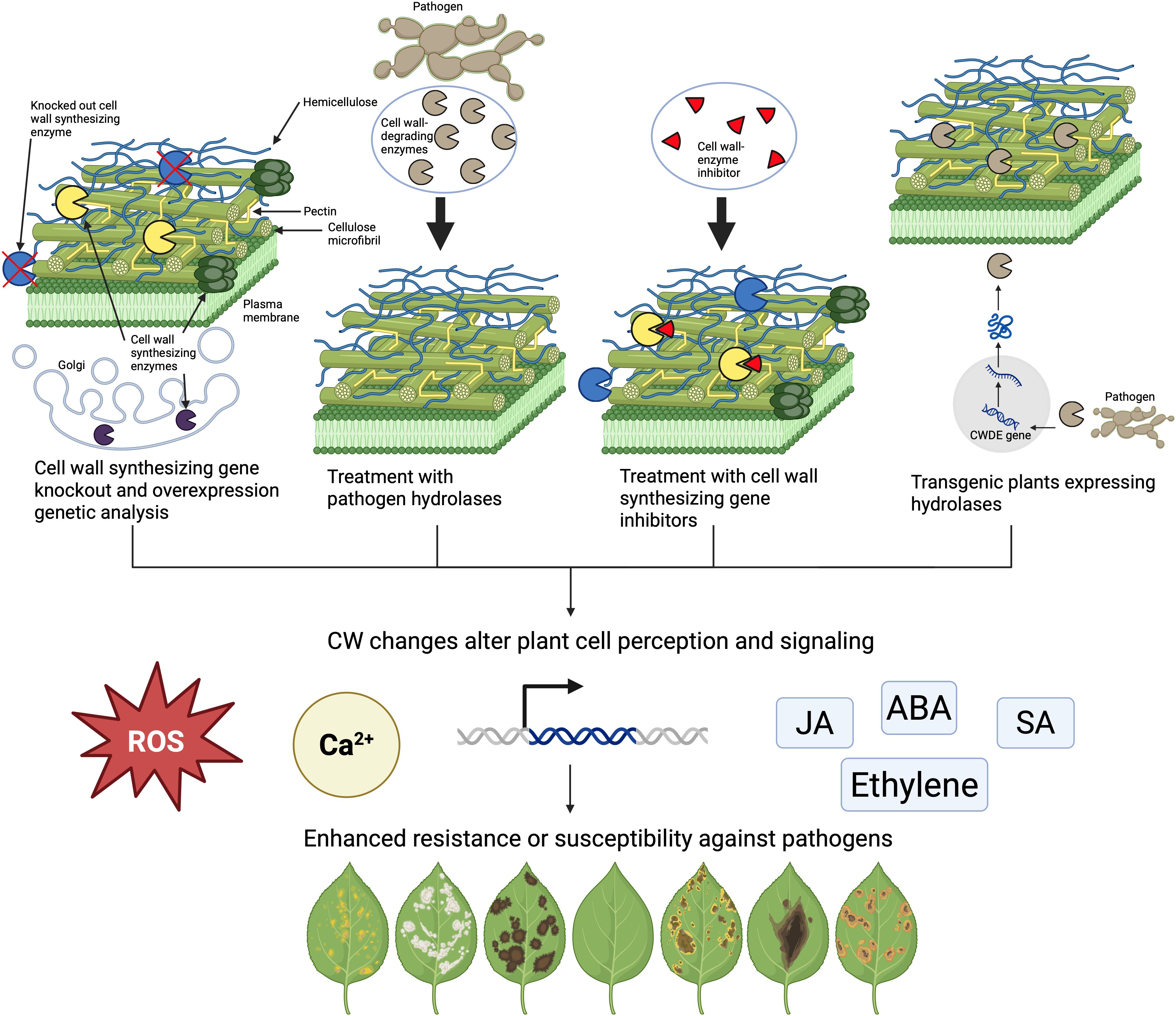 Figure 2. Four different approaches are commonly used to alter the CW to study its impact on plant immunity. Host plant genes involved in CW construction can be manipulated, CWs can be treated with isolated microbial enzymes, CW synthesizing enzyme inhibitors can be applied, or genes encoding CWDEs can be transformed into the plant. All these changes can have different effects on CW composition, plant morphology, hormone pathways, gene expression, reactive oxygen species (ROS) production, calcium signaling, and other PTI responses. These changes can alter how plants respond to pathogens.