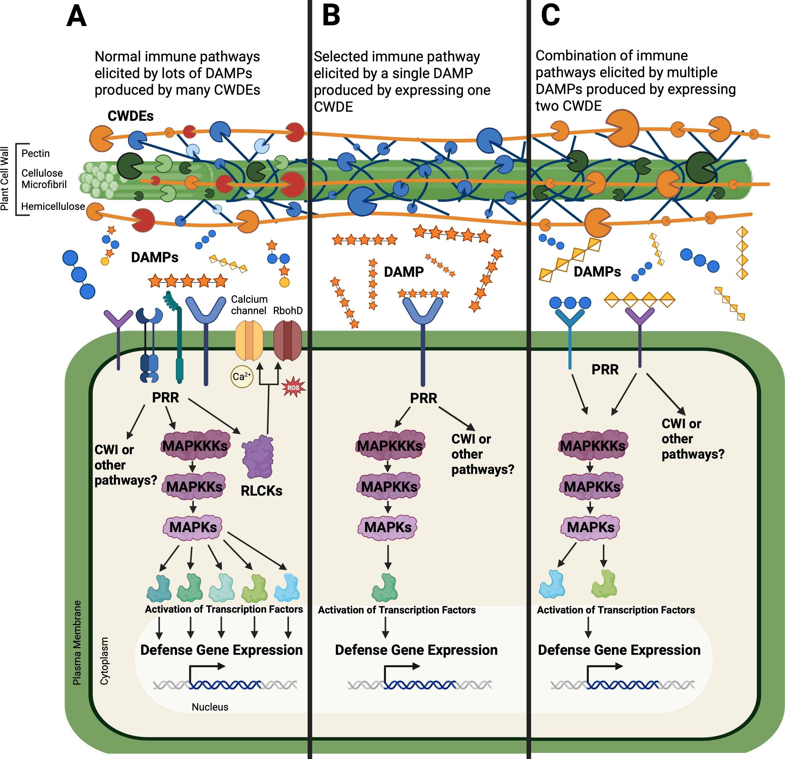 Figure 3. The transgenic plants expressing cell wall degrading enzymes (CWDEs) can allow for a more selective elicitation of the plant defense response. Normally during infection, pathogens secrete many different CWDEs that produce a host of damage-associated molecular patterns (DAMPs) from the CW, eliciting many immune pathways in the plant. DAMPs are perceived by pattern recognition receptors (PRRs) which can activate receptor-like cytoplasmic kinases (RLCK) to initiate calcium signaling (Ca2+) or reactive oxygen species (ROS) production through RbohD (respiratory burst oxidase homolog D). Additionally, mitogen-activated protein kinase (MAPK) can be phosphorylated to change defense gene expression, or the cell wall integrity (CWI) can be compromised inducing other changes. To isolate these responses, the expression of a single CWDE gene in plants can produce a single DAMP, eliciting only a few pathways. CWDE genes can also be expressed in specific combinations.