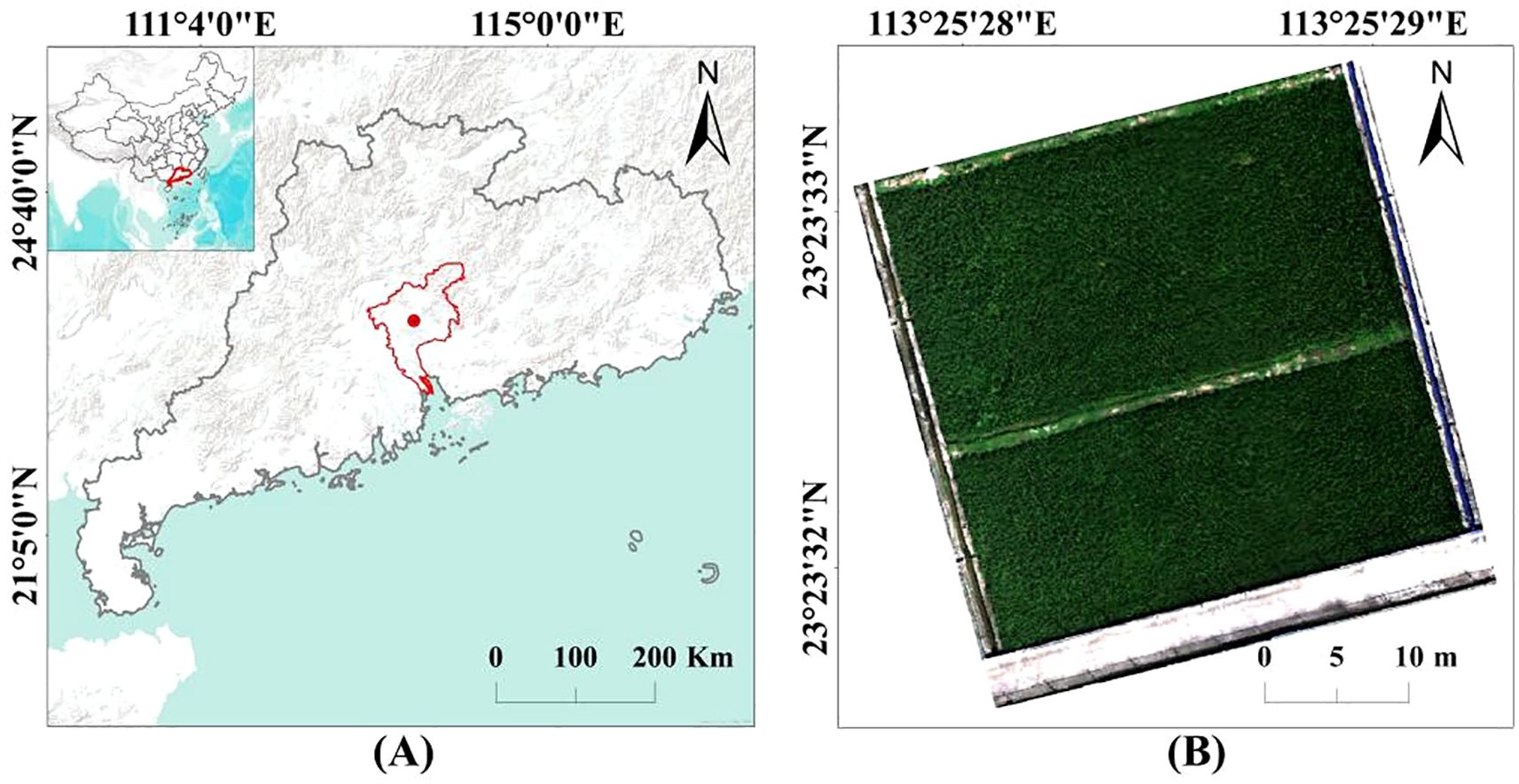 The research paddy field is located at the Baiyun Experimental Base, Guangdong Academy of Agricultural Sciences (23°39’ N, 113°42’ E, Figure 1). The area has a warm and humid climate, with an annual average temperature of about 23°C, relative humidity of approximately 74.8%, and about 1906 hours of sunshine annually. The average annual precipitation is approximately 1700 mm. The research paddy field spans an area of approximately 1135 m², and the rice variety used in the experiment is ‘Nanjing Xiang Zhan’.