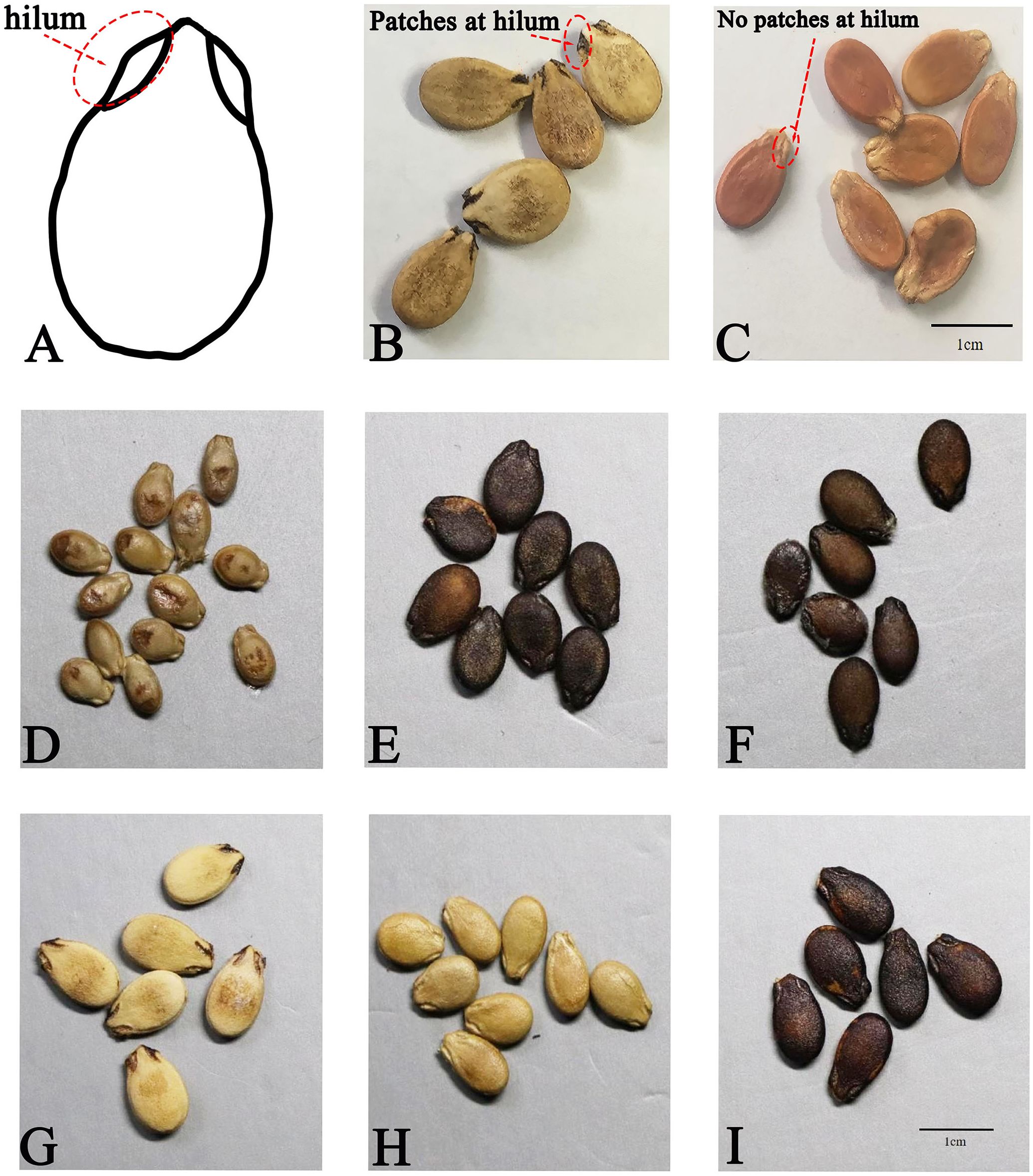Figure 1. Phenotype information of patches at the hilum on the testa of watermelon seeds. (A) Location of the hilum on a watermelon seed diagram. (B) Seeds with patches at the hilum on the testa. (C) Seeds without patches at the hilum on the testa. (D) Female parent, B132, without patches at the hilum on the testa. (E) Male parent, B135, with patches at the hilum on the testa. (F) F1 generation, B139, with patches at the hilum on the testa. (G) 17CB243 of the BC population, with patches at the hilum on the testa. (H) 17CB222 of the BC population, without patches at the hilum on the testa. (I) 17CB276 of the BC population, seeds for which patches at the hilum on the testa could not be determined.
