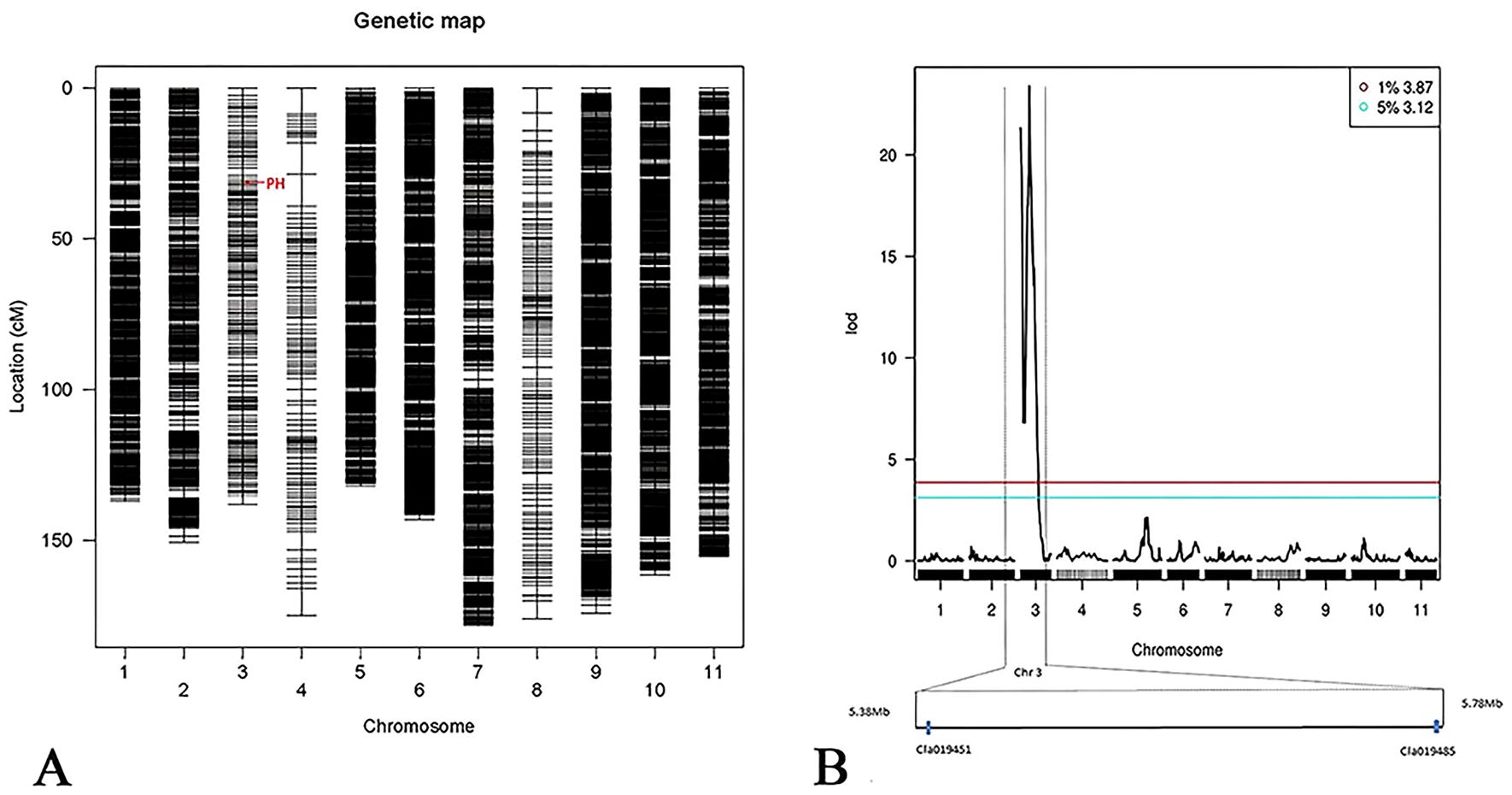 Figure 2. Genetic map for chromosome 3. (A) The resulting association for patches at the hilum is indicated on the watermelon chromosome 3, showing the region controlling the trait. The horizontal axis represents the watermelon chromosomes, with PH marking the gene location. (B) A locus for patches at the hilum of watermelon seeds was identified through QTL mapping. The PH gene is located on chromosome 3, within the region spanning Cla019451~Cla019484 (5.38–5.78 Mb).