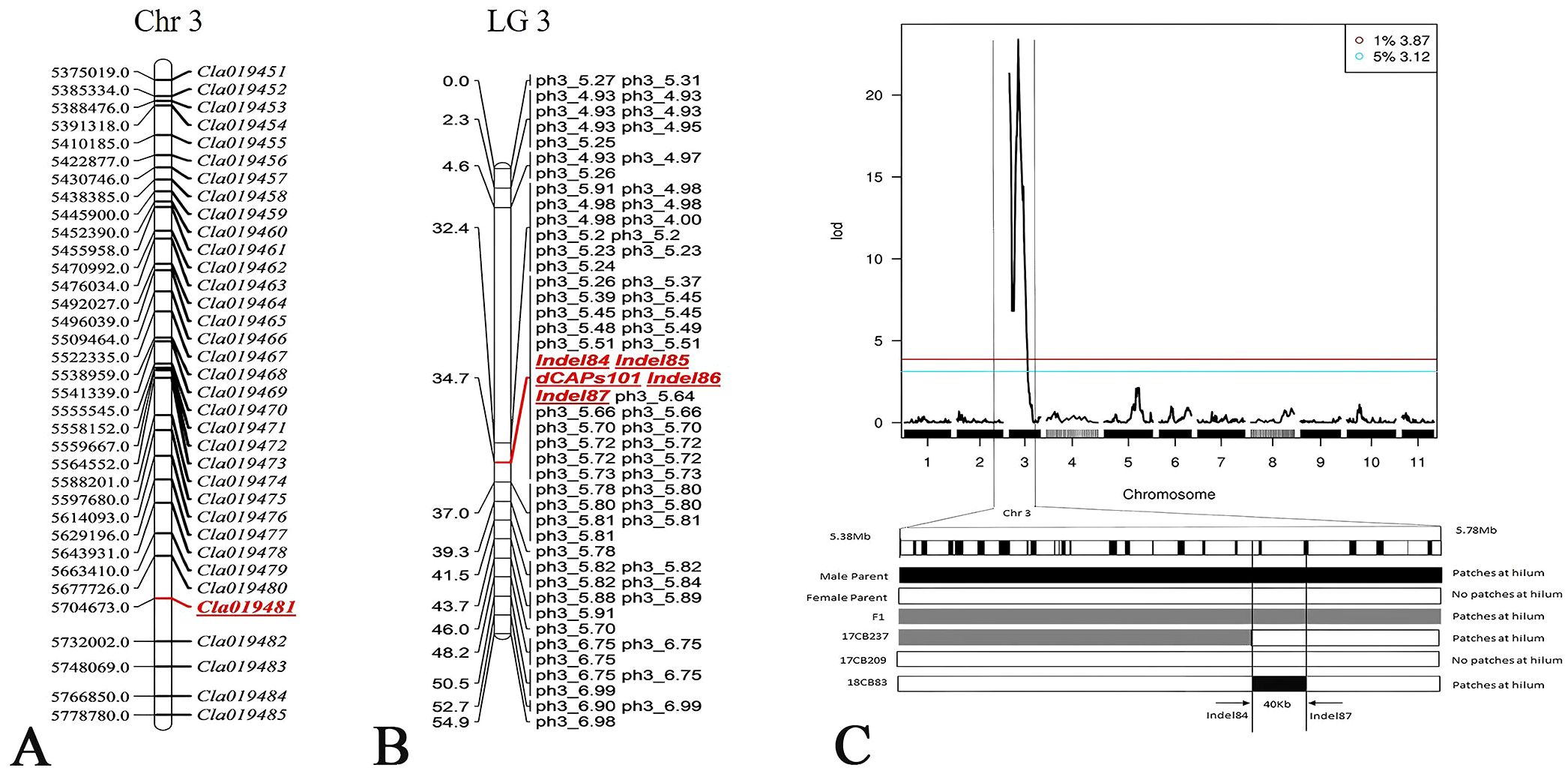 Figure 3. The gene loci and specific Indel and SNP markers at 34.7 cM within a 40-kb interval on chromosome 3. (A) The 35 gene loci in the region spanning 5,375,019–5,778,780 bp on watermelon chromosome 3, including gene Cla019481. (B) Consensus SNP and Indel markers for linkage group 3 (LG3) of Citrullus lanatus. Markers from Indel84 to Indel87, together with dCAPs101, cover an approximate genetic distance of 34.7 cM. (C) Two individuals (17CB237, 18CB83) of the 96 tested were estimated to carry the fine-mapped patches-at-the-hilum gene between markers Indel84 and Indel87, corresponding to a 40-kb interval on chromosome 3.