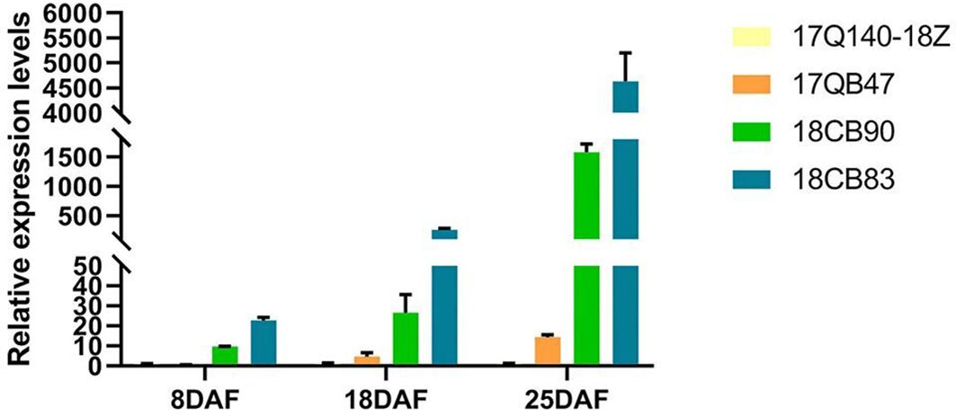 Figure 4. Relative expression levels of gene Cla019481 during different seed developing periods in four materials. 17Q140-18Z and 17QB47 lack patches at the hilum, whereas 18CB90 and 18CB83 possess patches at the hilum. Error bars represent the mean ± standard deviations (SDs) of three biological replicates. DAF, days after flowering.