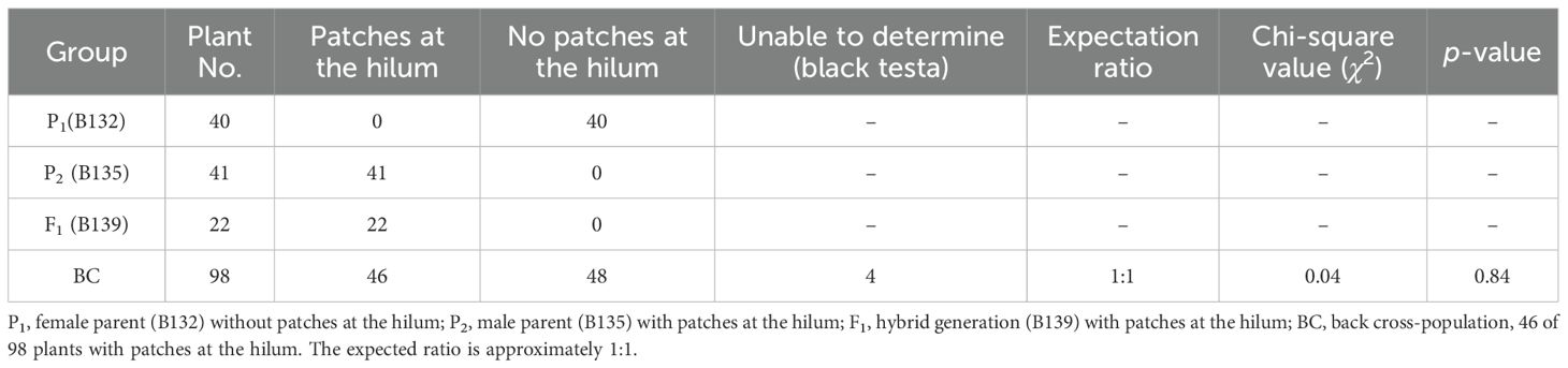 A total of 96 individuals (Supplementary File ST1-B1) underwent genotyping analysis, comprising 94 BC progeny (excluding four individuals with visually undetermined seeds, black testa; Figure 1I) and two validation accessions, B5–8 and 18CB83 (both exhibiting patches at the hilum visually).