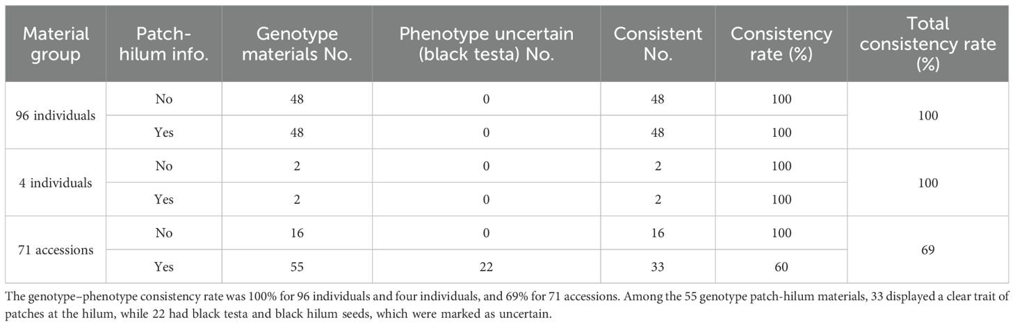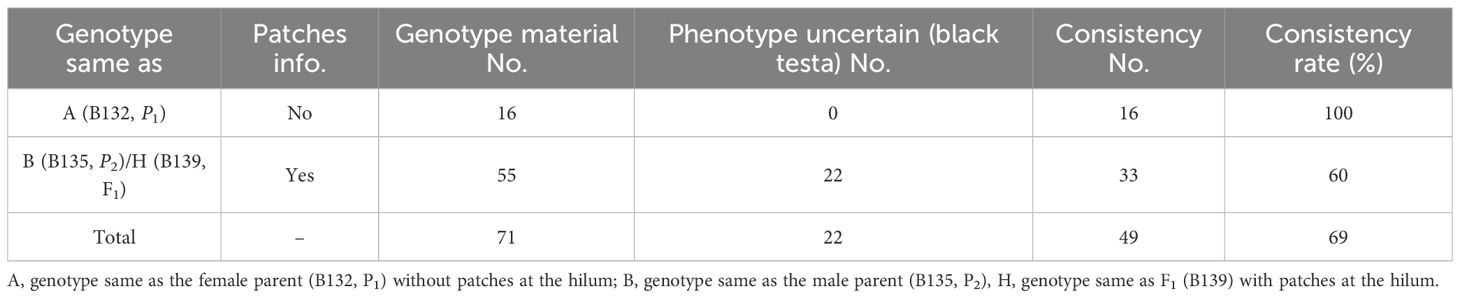 The black color of the testa occasionally obscured visual identification of patches at the hilum, particularly in accessions with dark testa and dark-hilum seeds (Figures 1E, F, I). F1 (B139) (Figure 1F), crossed back with female parent B132 (Figure 1D), produced a BC population exhibiting separated phenotypes of seeds with patches at the hilum (Figure 1G) and seeds without patches at the hilum (Figure 1H). For this reason, we considered the male parent (B135) (Figure 1E) and F1 (B139) (Figure 1F) as patch-hilum materials for the genotype–phenotype study. For ease of comparison, we selected materials with clearly distinguishable seeds—those with umbilical patches and those without—for a genotype–phenotype consistency study, excluding the four materials with black testa and undetermined patches in the BC population (Figure 1I). Among the 71 watermelon accessions with complex genotypic germplasm resources, 22 exhibited an uncertain phenotype (Table 2) due to black testa and black hilum. In Supplementary File ST1-B2, we marked these as “without patches at hilum” according to the description of Ma (2005). Seeds with black testa also exhibited darker coloration in the hilum region compared to other parts during seed development. However, no phenotypic inconsistency was found in materials with the same genotype as B132 (female parent), which had no patches at the hilum (Table 3; Supplementary File ST1). We infer that watermelon seeds with black testa and black hilum can be considered seeds with patches at the hilum.