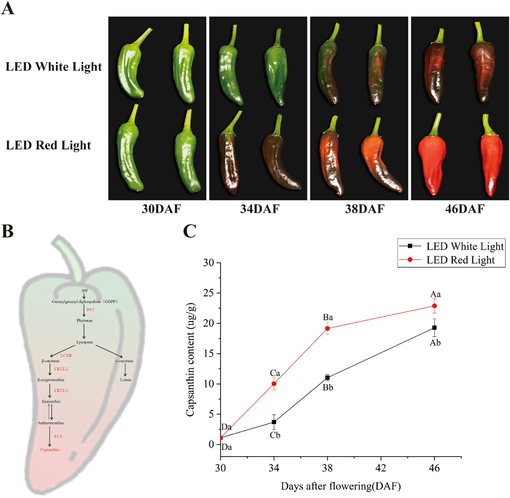 (A) Images showing pepper maturation stages under LED white and red lights at 30, 34, 38, and 46 days after flowering (DAF). Peppers under red light show advanced ripening, turning red by 46 DAF. (B) Diagram illustrating the biosynthesis pathway of capsanthin in peppers, including key enzymes. (C) Line graph comparing capsanthin content in peppers under LED white and red lights over time, with red light showing higher capsanthin content. Data points are marked with different letters indicating significant differences.