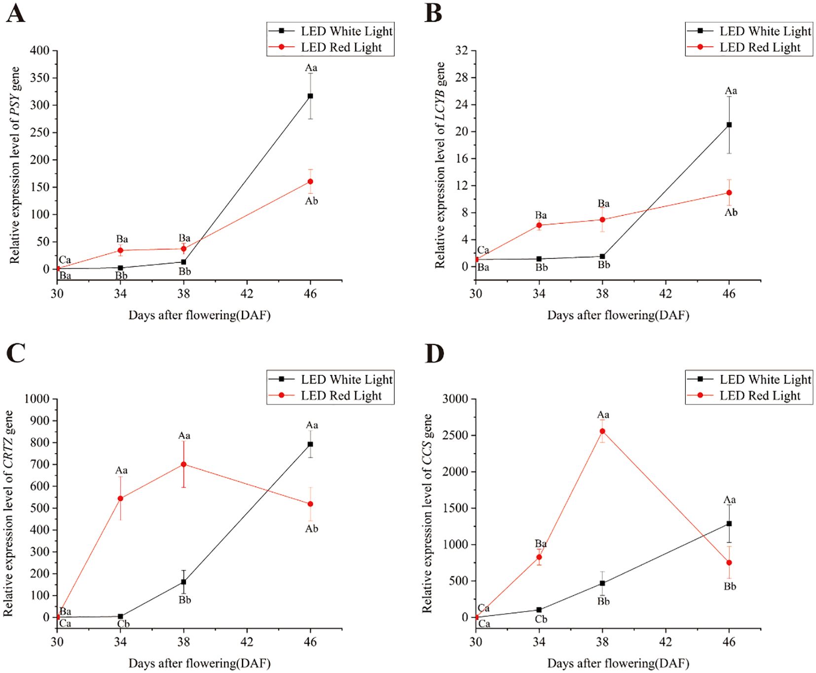 Figure 2. Effects of pre-harvest LED light on the relative expression levels of key structural genes in the capsanthin biosynthesis pathway. (A) PSY; (B) LCYB; (C) CRTZ; (D) CCS. Different capital and lowercase letters indicate significant difference at the p < 0.05 level under the same light treatment and same treatment duration, respectively.