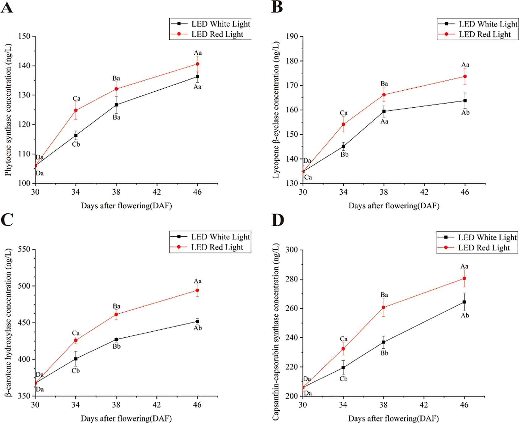 3.3 Effects of pre-harvest red LED light on the concentration of key enzymes in the capsanthin biosynthesis pathway