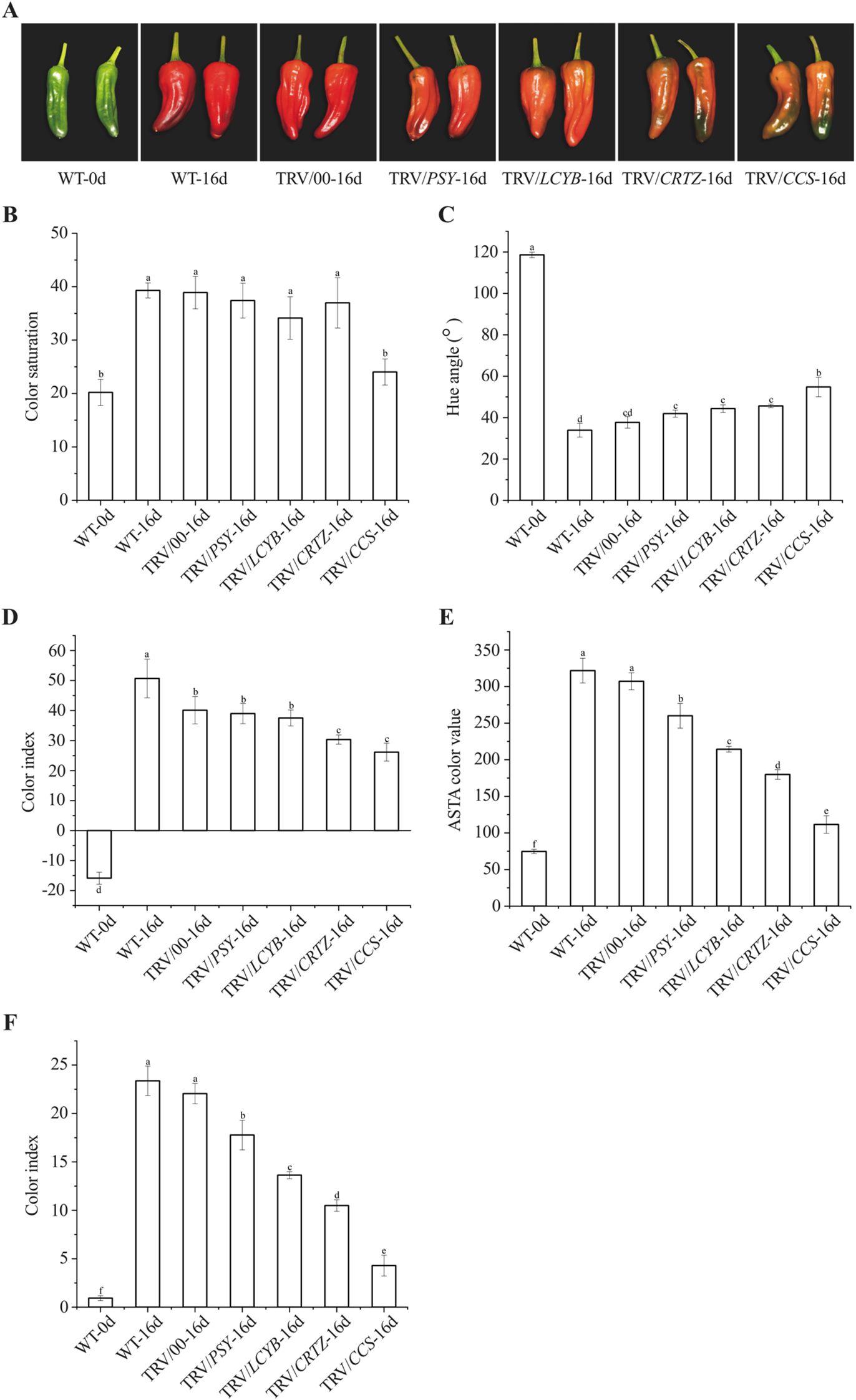 Panel A shows peppers of varying colors labeled WT-0d, WT-16d, TRV/00-16d, TRV/PSY-16d, TRV/LCYB-16d, TRV/CRTZ-16d, and TRV/CCS-16d. Panels B to F are bar graphs illustrating color metrics for each pepper label: B shows color saturation, C shows hue angle, D shows color index, E shows ASTA color value, and F shows another color index. Bars are marked with letters indicating statistical differences.